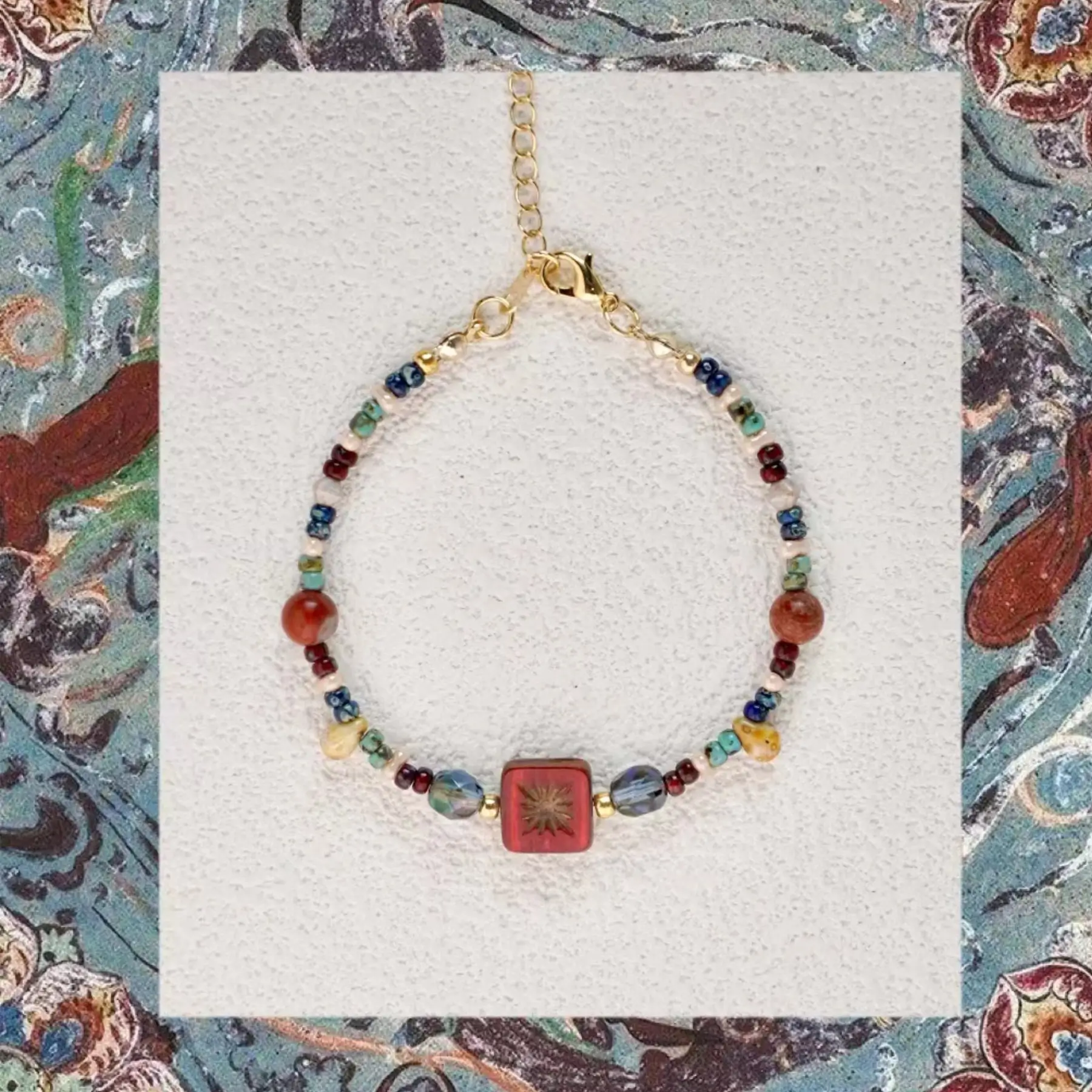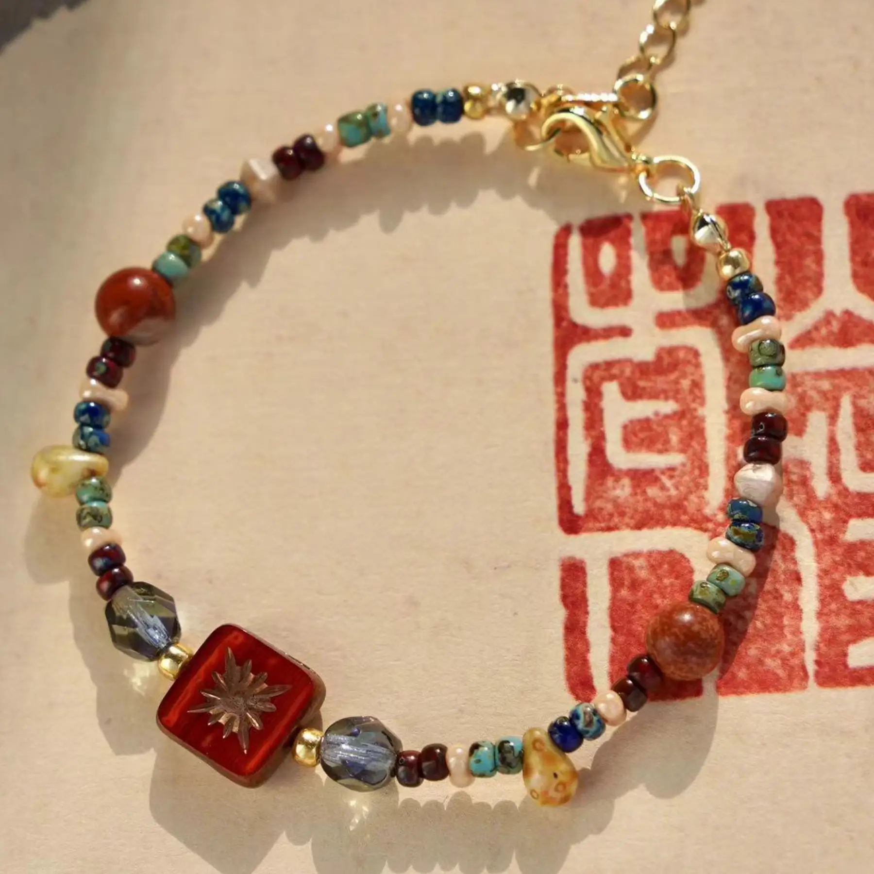 This handmade beaded bracelet from the Dunhuang Encounter Series combines cultural inspiration with refined craftsmanship. Featuring vintage Czech glass beads in red, blue, and green, delicate Miyuki seed beads, and 14K gold-filled components, it is a wearable expression of timeless elegance.