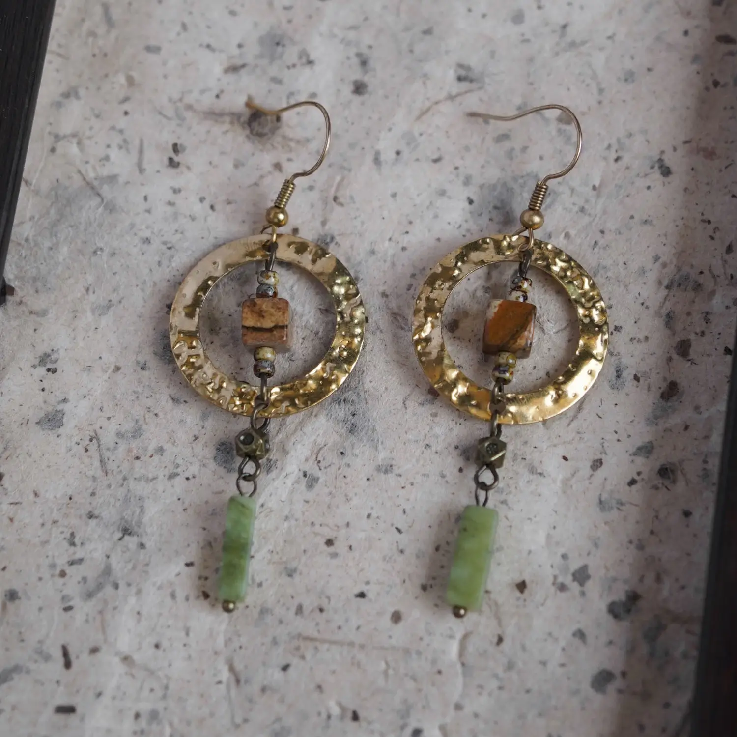 The Moon Creek Vintage Brass Earrings capture the tranquil rhythm of water flowing beneath a silver moon. Hand-hammered brass forms a textured, sculptural base that catches the light, while elongated Southern Jade and marbled picture stones evoke the grounding presence of a misty mountain landscape.