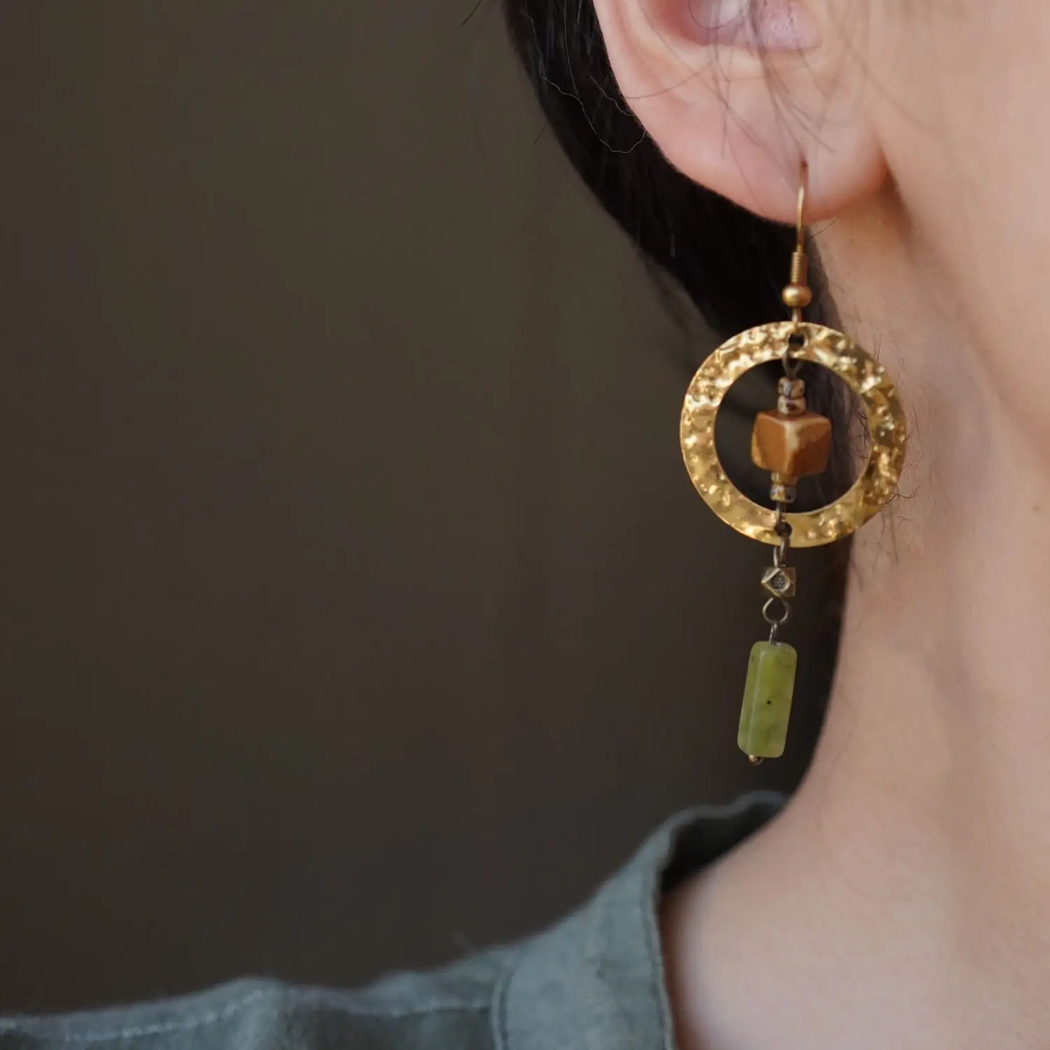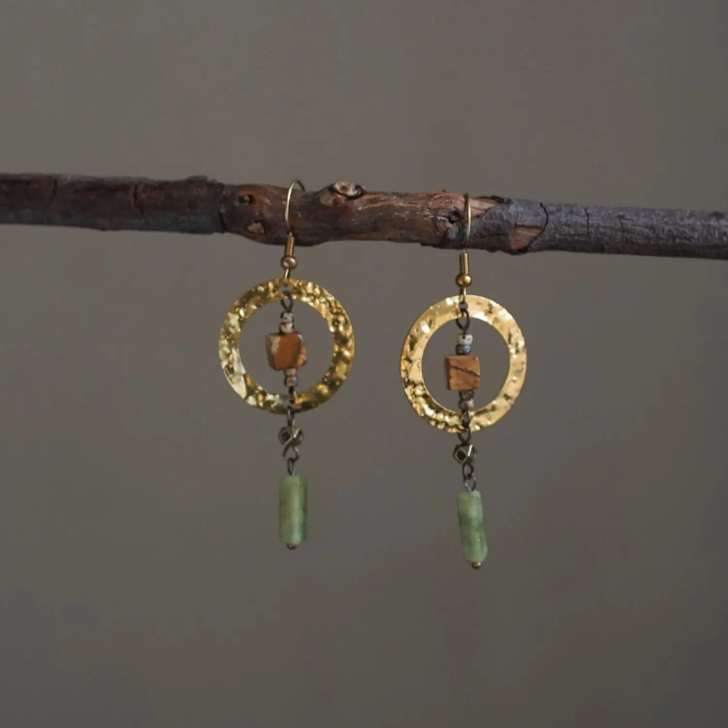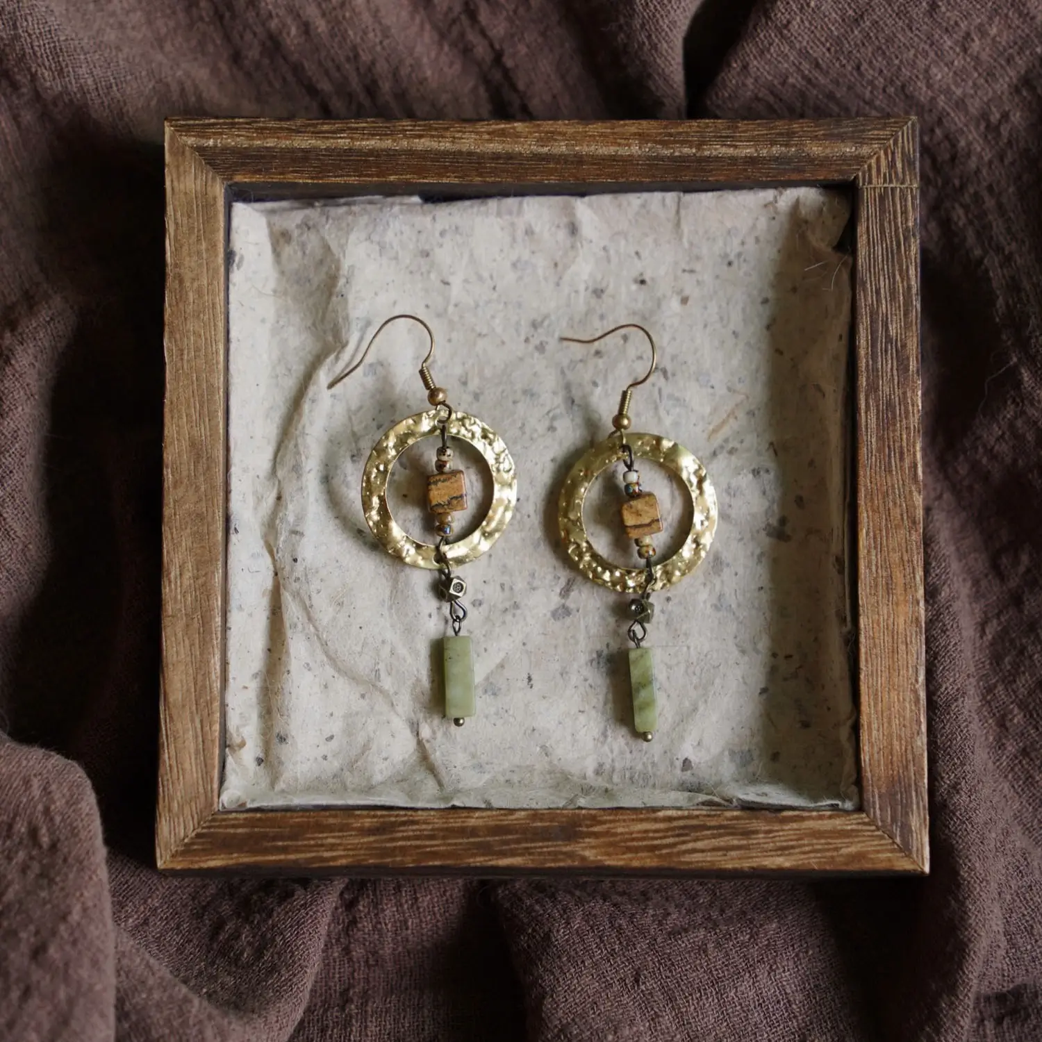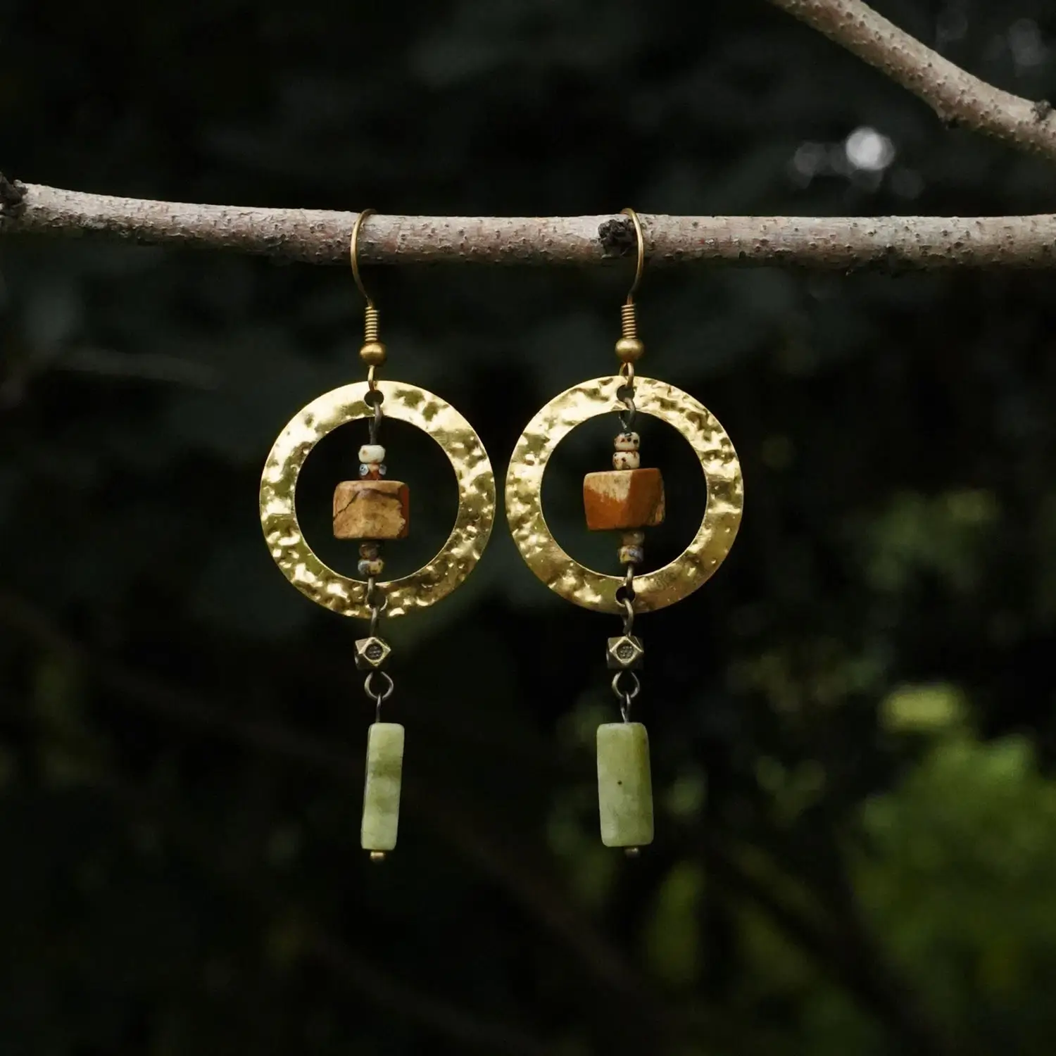 Inspired by the quiet elegance of a moonlit stream, these handcrafted Vintage Brass Earrings blend hammered brass, natural Southern Jade, and unique picture stones with vintage accents. Lightweight yet deeply expressive, they bring a refined New Chinese aesthetic to your everyday wardrobe — a perfect balance of Zen simplicity and timeless charm.