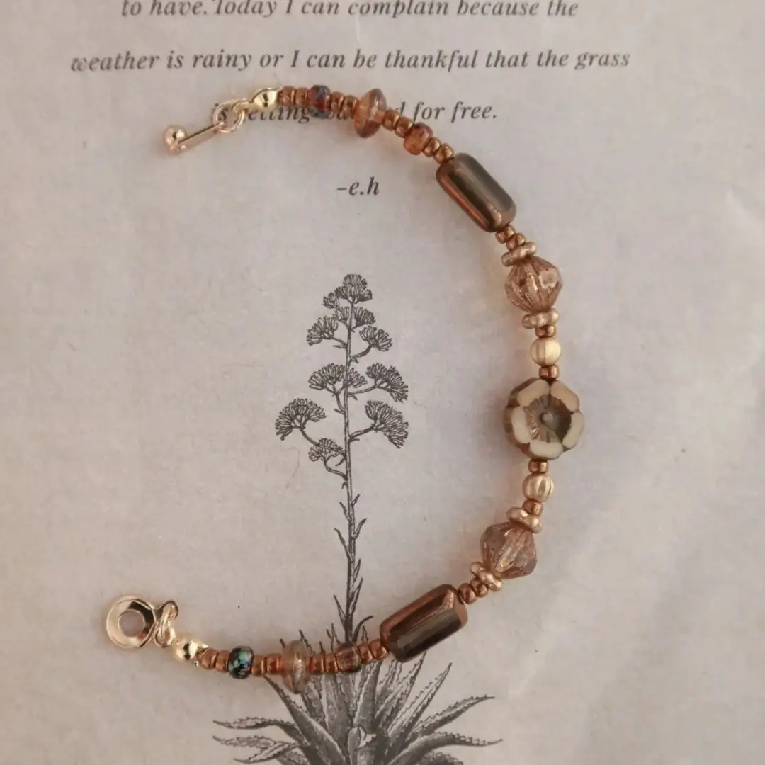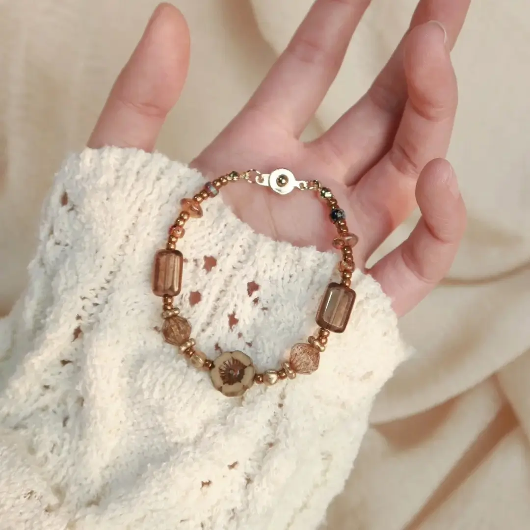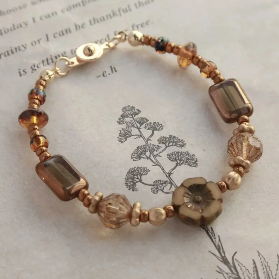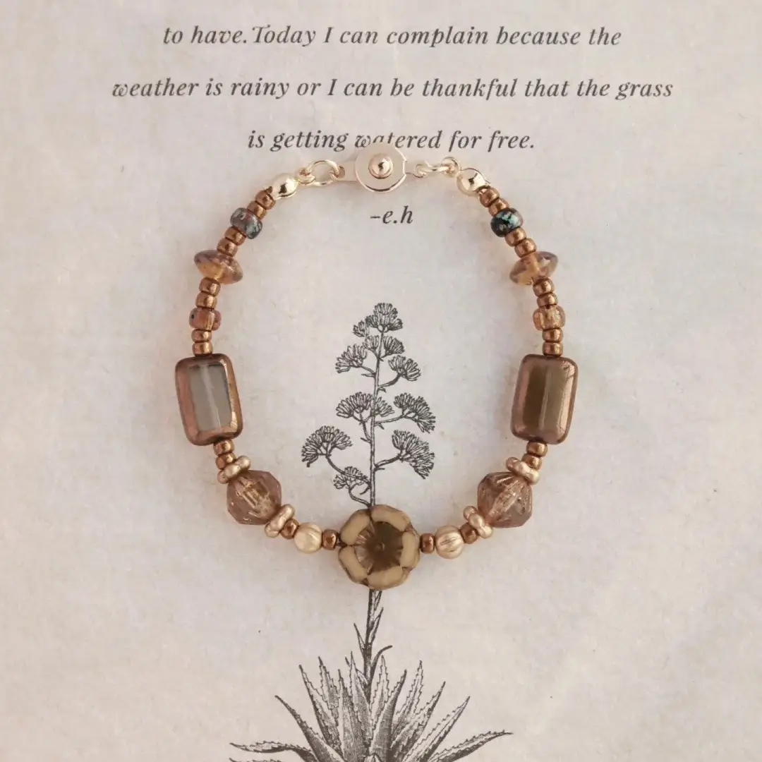 Thisvintage mocha Czech glass bead bracelets is a truly special piece. We craft it with care. In fact, it was inspired by nature’s peaceful beauty. The bracelet’s mocha tones invite you to slow down. Therefore, it serves as a gentle reminder to pause in a fast-paced world.