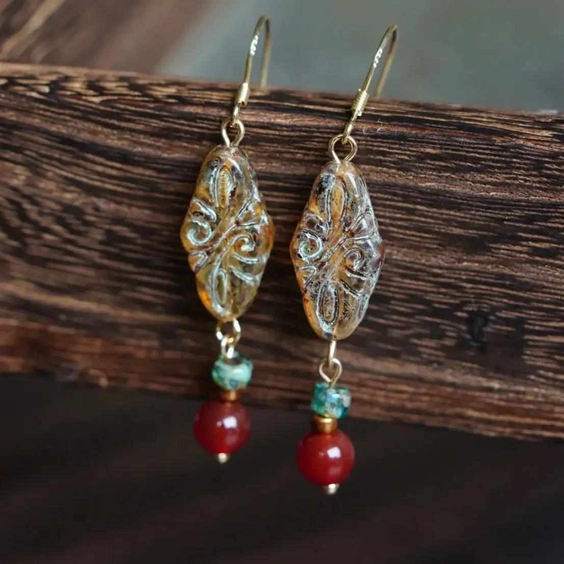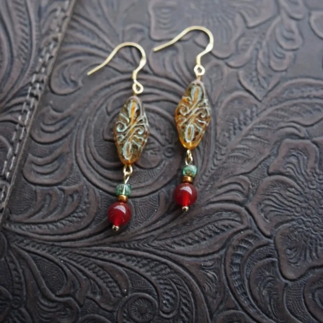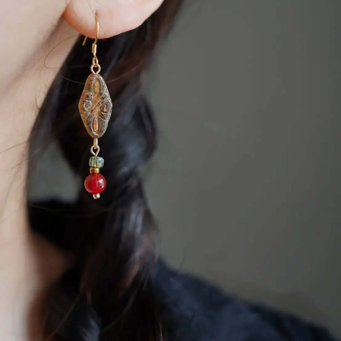 Handmade gemstone earrings with vintage Czech glass and natural red agate, reflecting timeless artistry and New Chinese elegance, ideal for work, social events, or weekend outings.