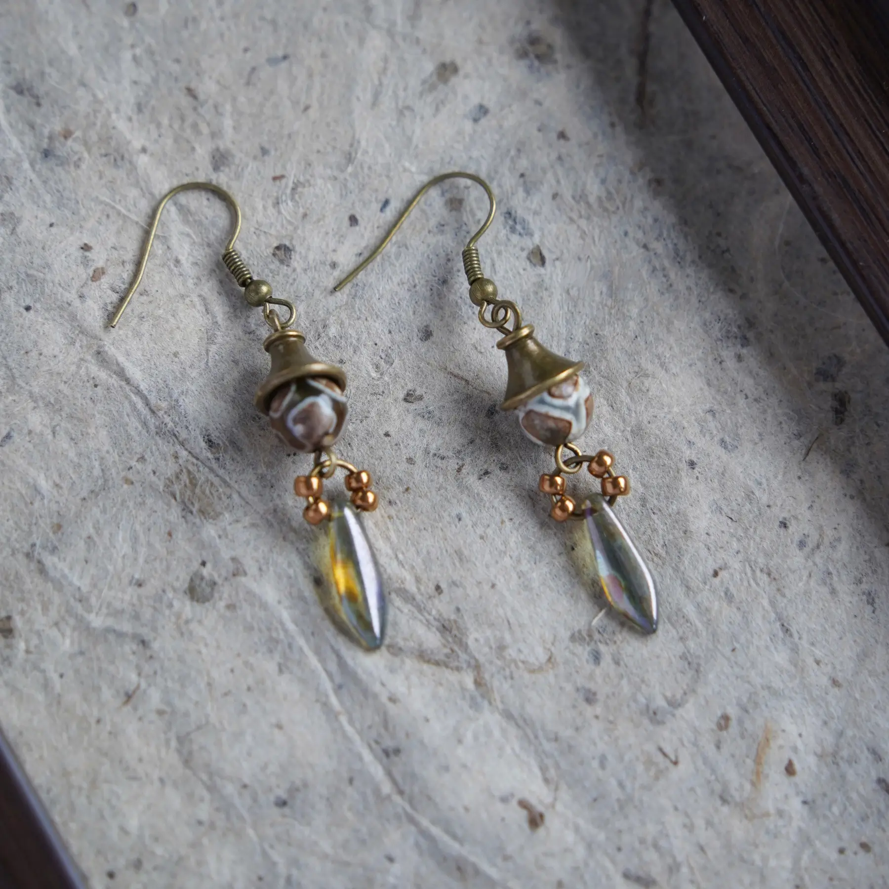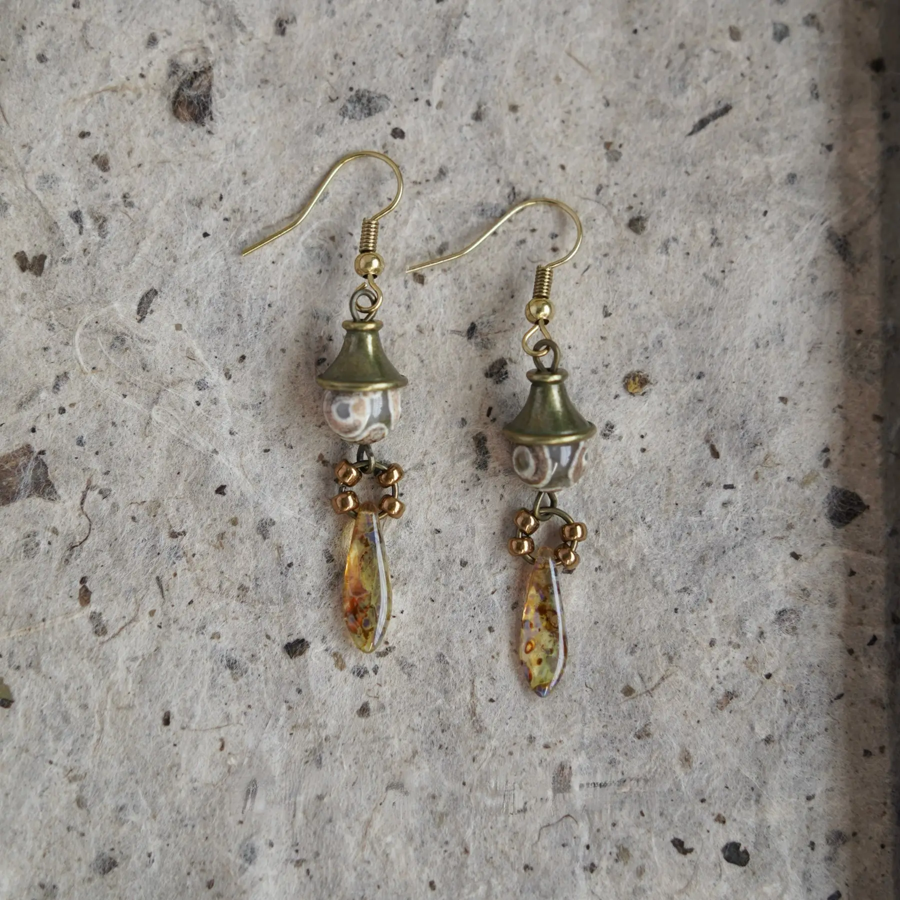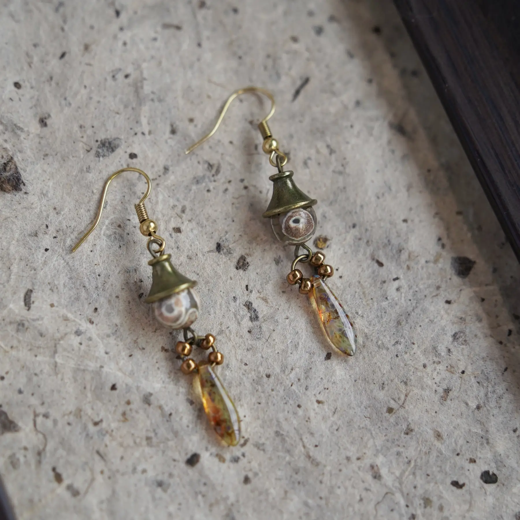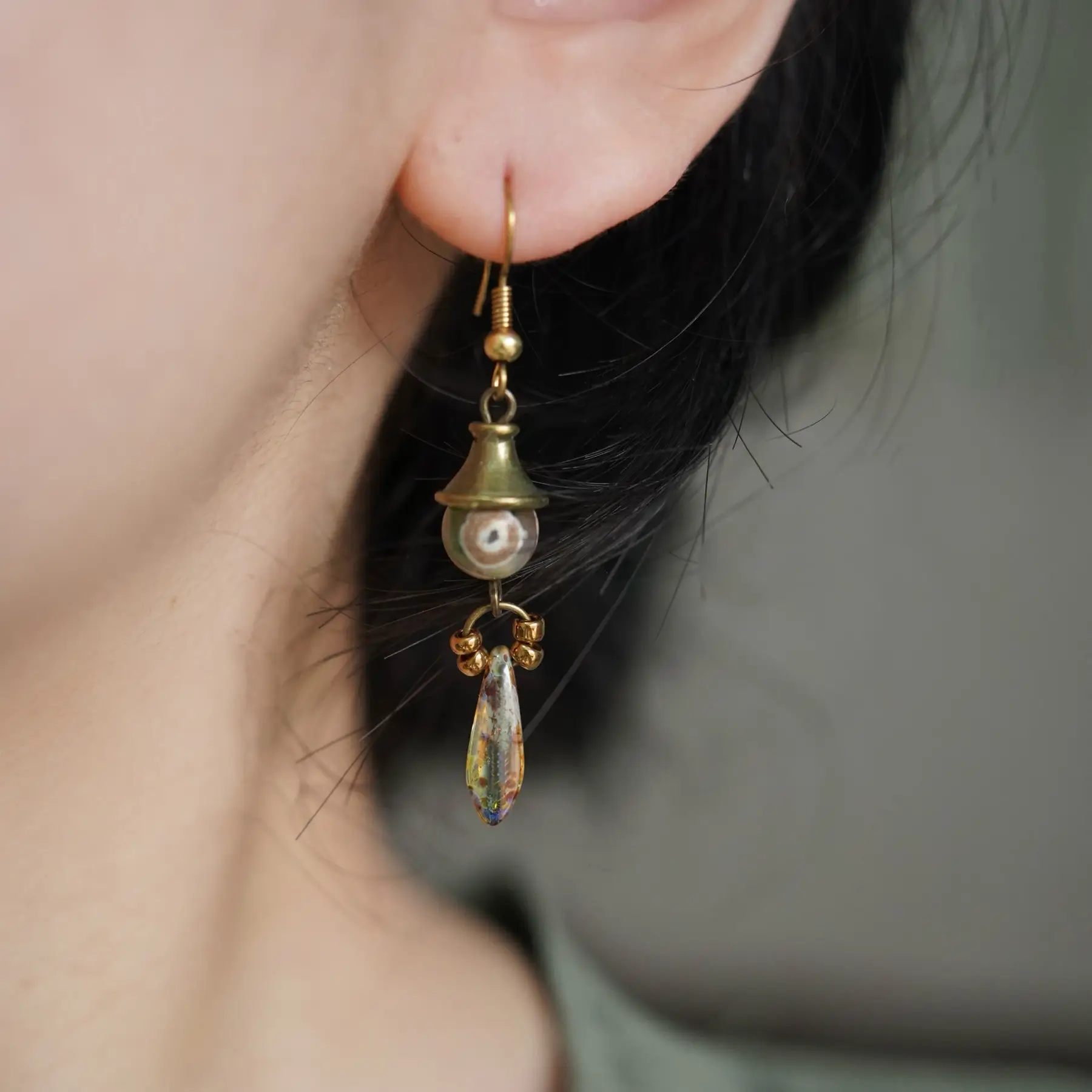 Inspired by the warm glow of honeyed amber and quiet woody tones. The Qi Meng series reinterprets timeless elegance through these Handmade Glass Bead Earrings. Featuring antique brass accents and luminous glass, they are designed to sway gently like candlelight, bringing a soulful, vintage-inspired atmosphere to your everyday wardrobe.