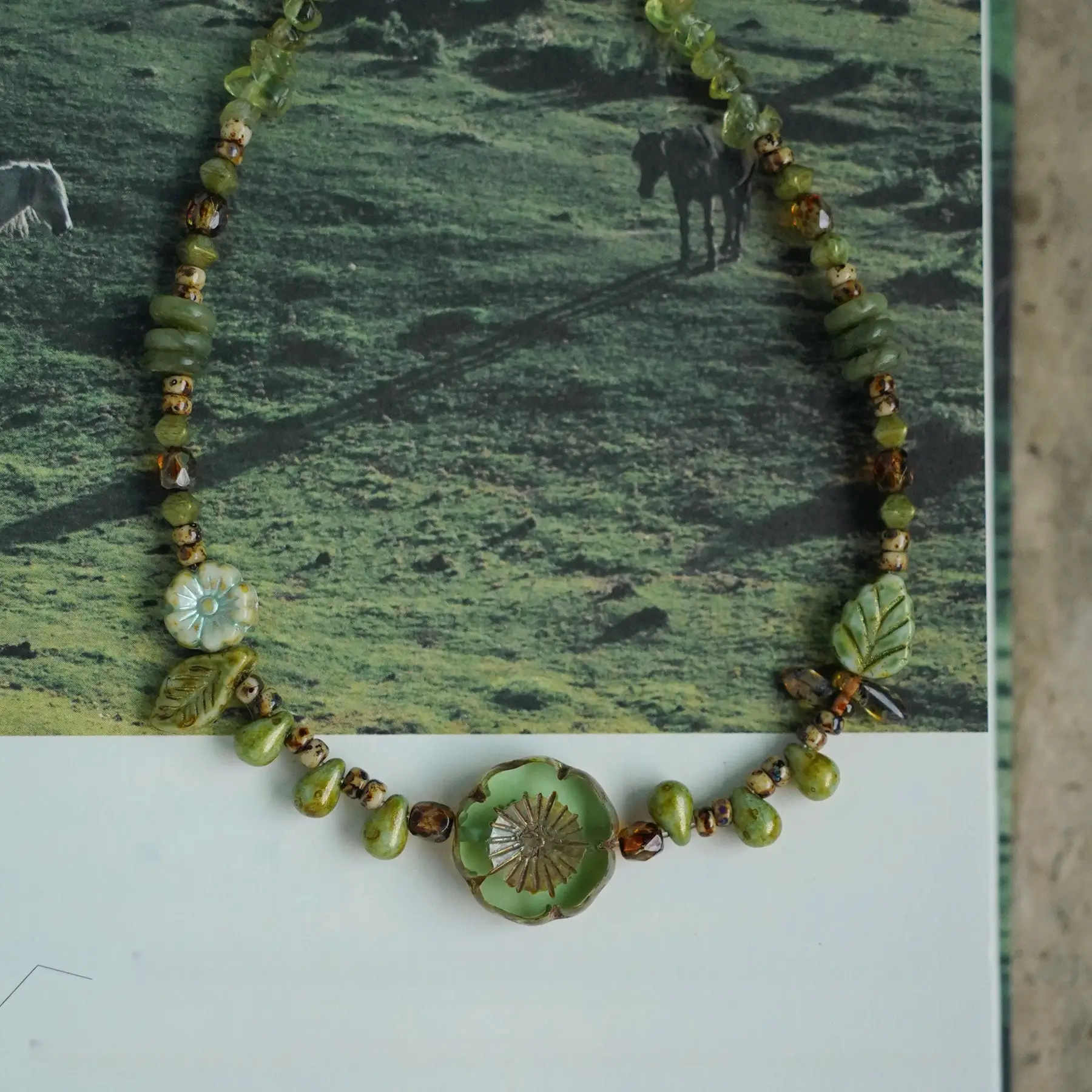 This handcrafted necklace features green natural stones and vintage Czech beads. With three centerpiece options, Infused with the power of nature and thoughtfully packaged, it makes a heartfelt gift for a friend.