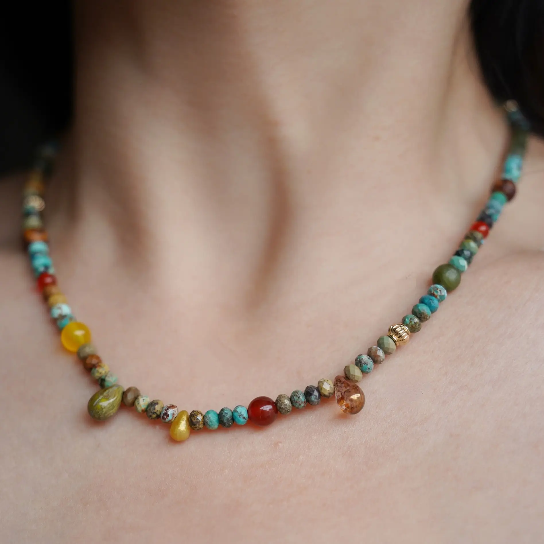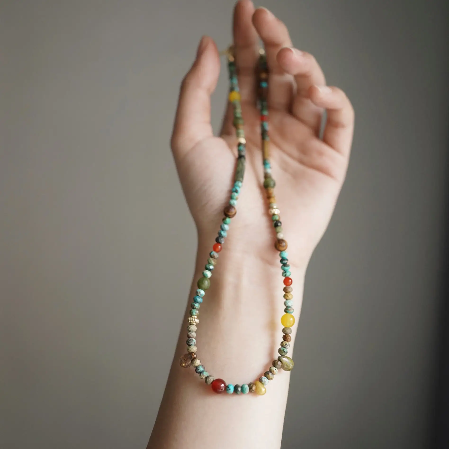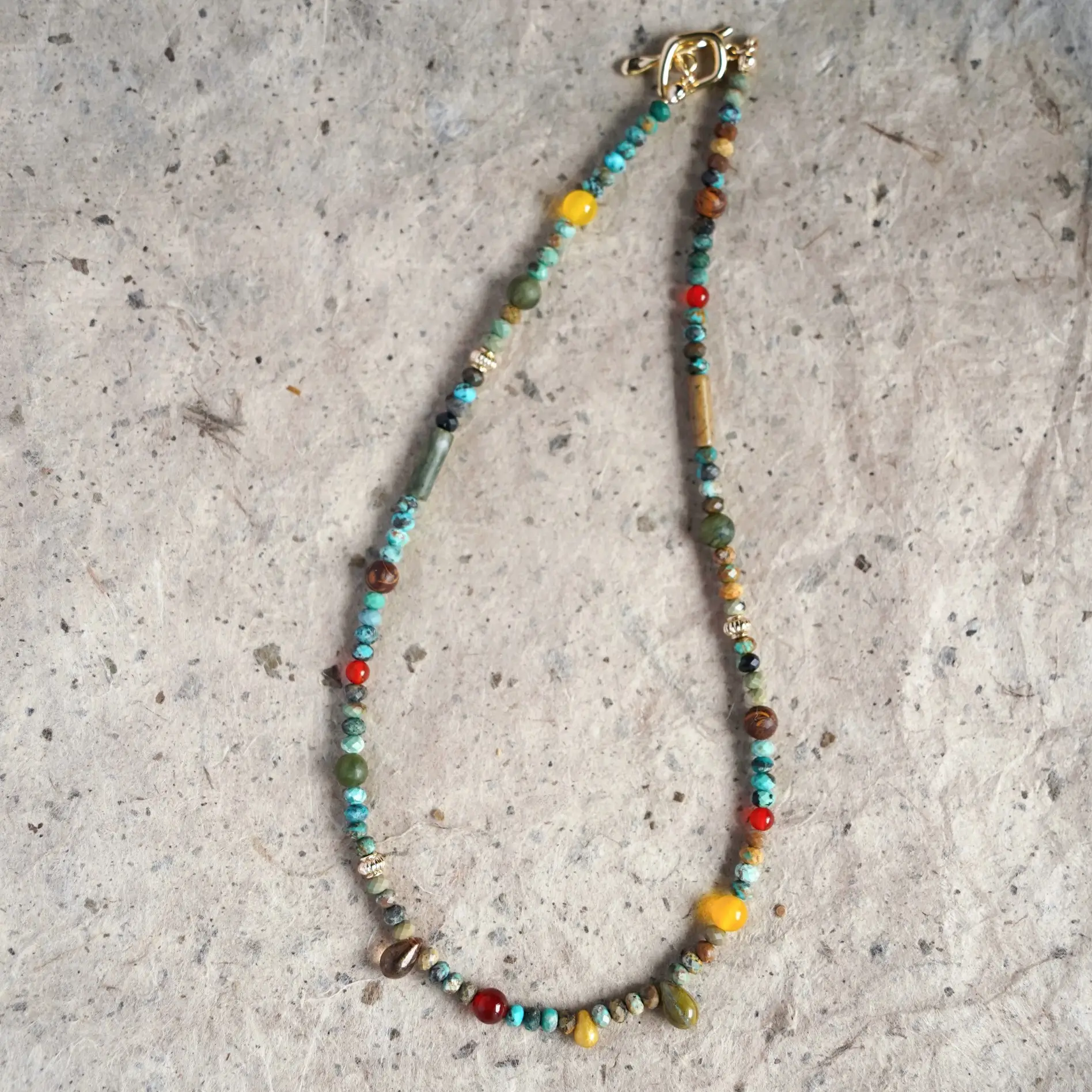 Inspired by Dunhuang’s timeless art, this handmade colorful turquoise necklace blends colorful gemstones that bring boho charm to your look. Perfect for women seeking vibrant, artistic everyday jewelry that can be layered