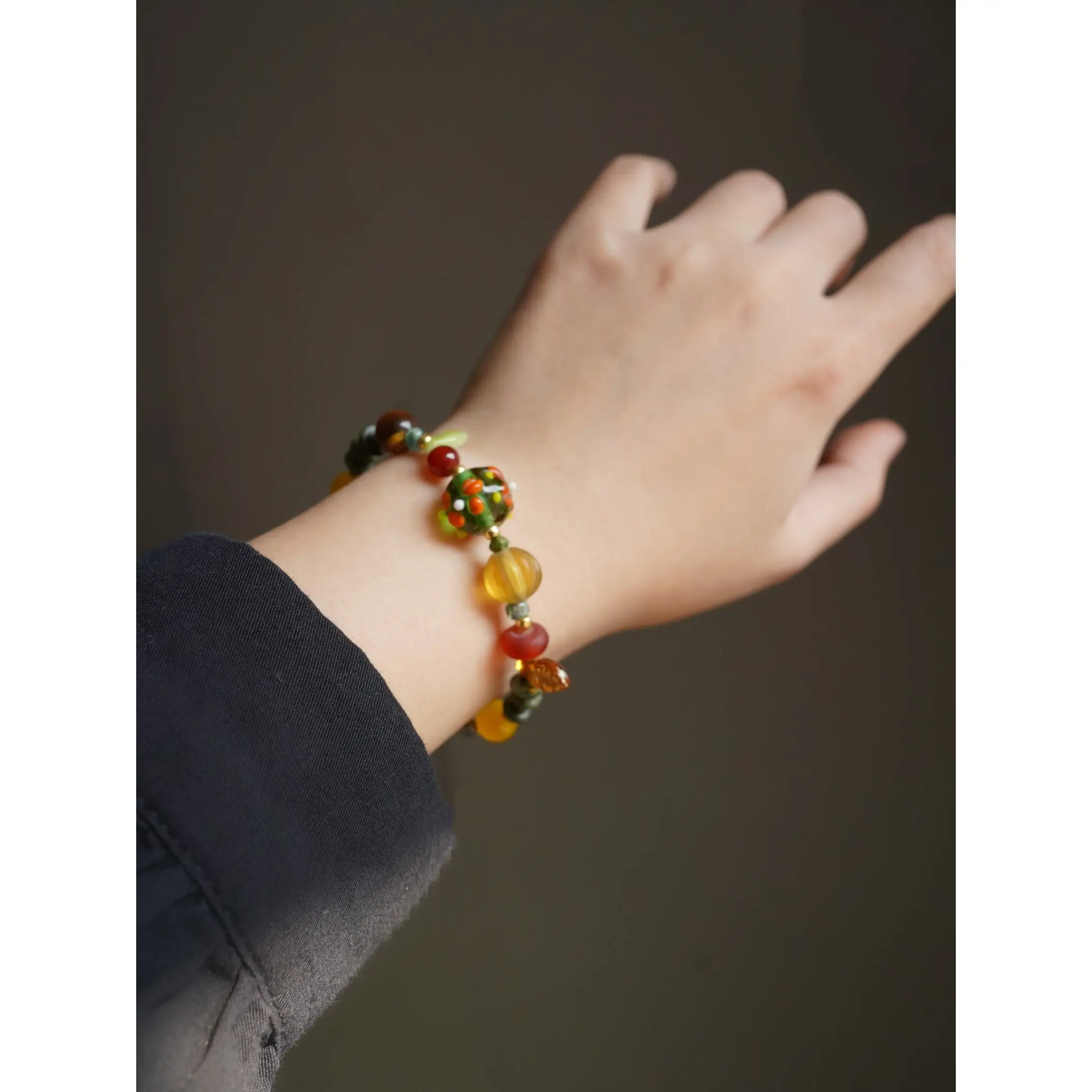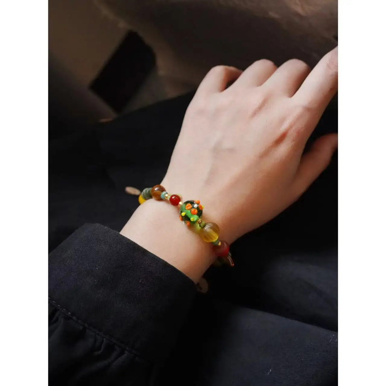 This handmade bracelet pairs well with minimalist outfits for a subtle pop of color, bohemian styles with flowy fabrics and florals, or vintage-inspired looks. It can be worn solo for elegance or layered with matching earrings and other bracelets for a playful, artistic statement.