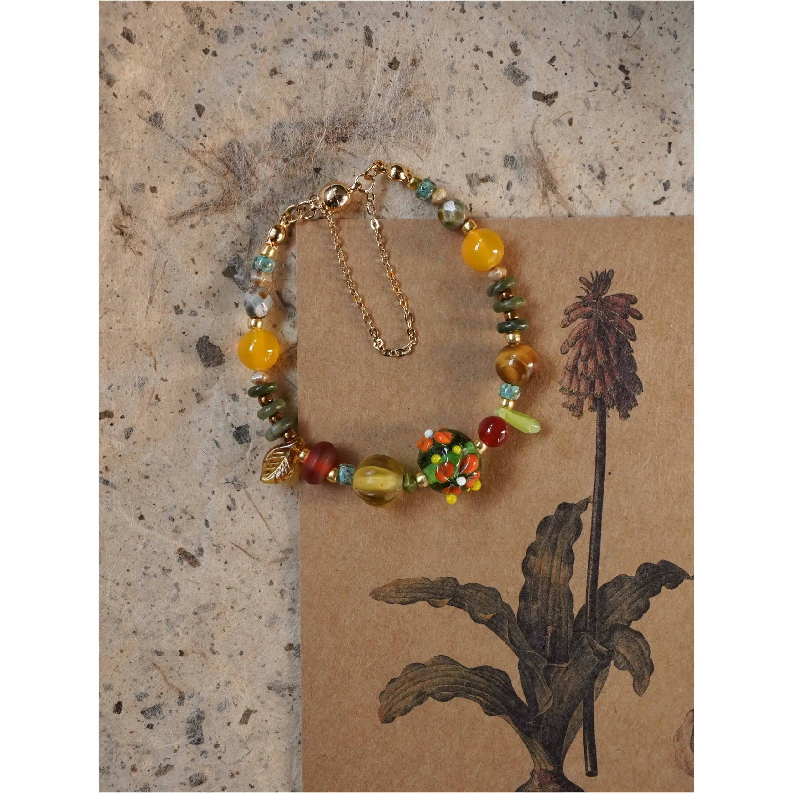 Each bracelet is carefully handcrafted, blending a palette of colors and textures that feel both playful and sophisticated. We thoughtfully combine Nepalese glass beads, red and yellow agate, tiger’s eye, jade, and Czech accents, securing everything with a strong magnetic clasp for easy wear.