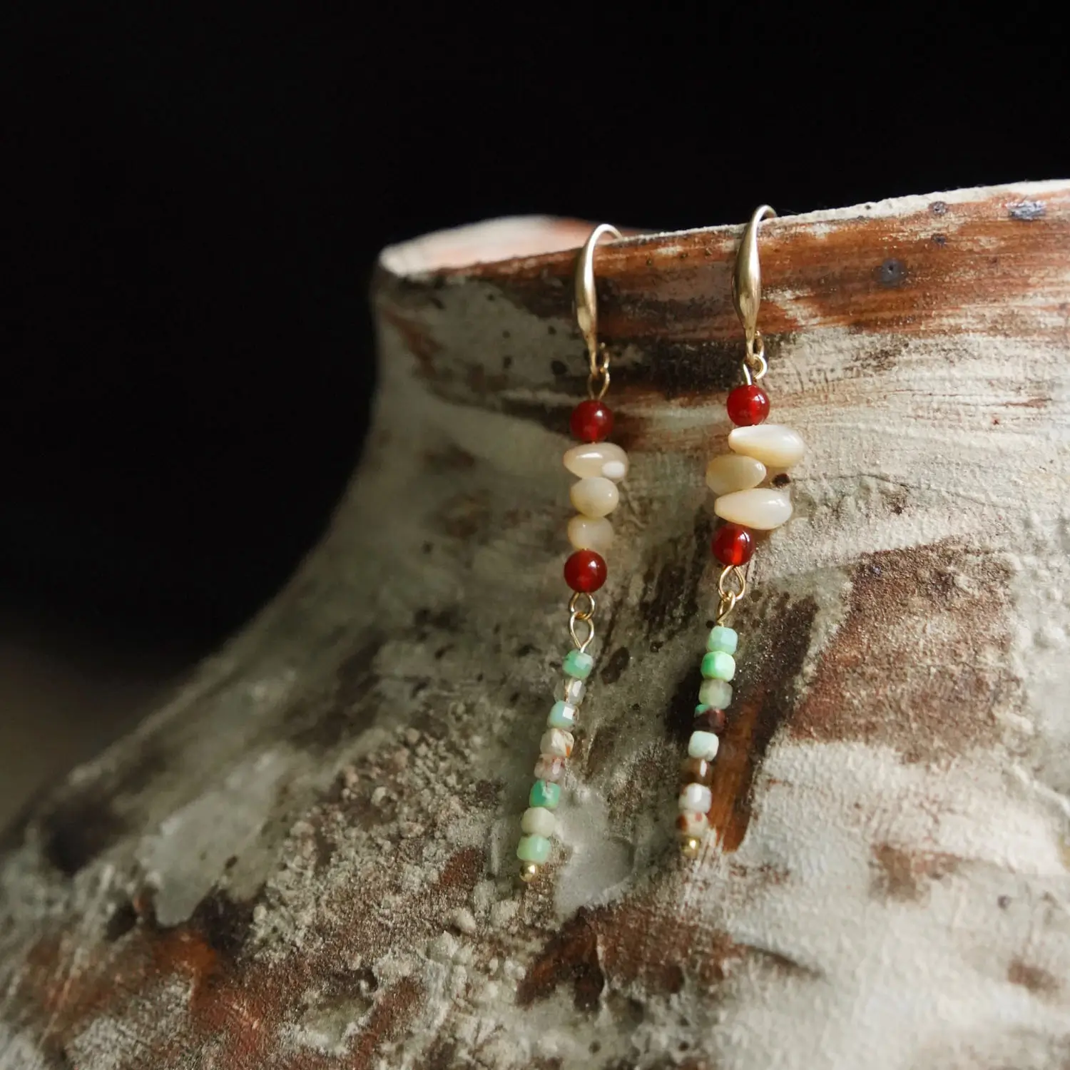 Inspired by the endless horizon of the Pacific coast, the Malibu Linear Drops feature a harmonious mix of Red Agate, Turban Shell, and Chrysoprase. Crafted with a premium 14K Gold Vermeil base (thick gold over 925 Sterling Silver), these handmade long dangle earrings offer an enduring luster and skin-friendly comfort. Lightweight and versatile, they are the perfect expression of modern coastal elegance.