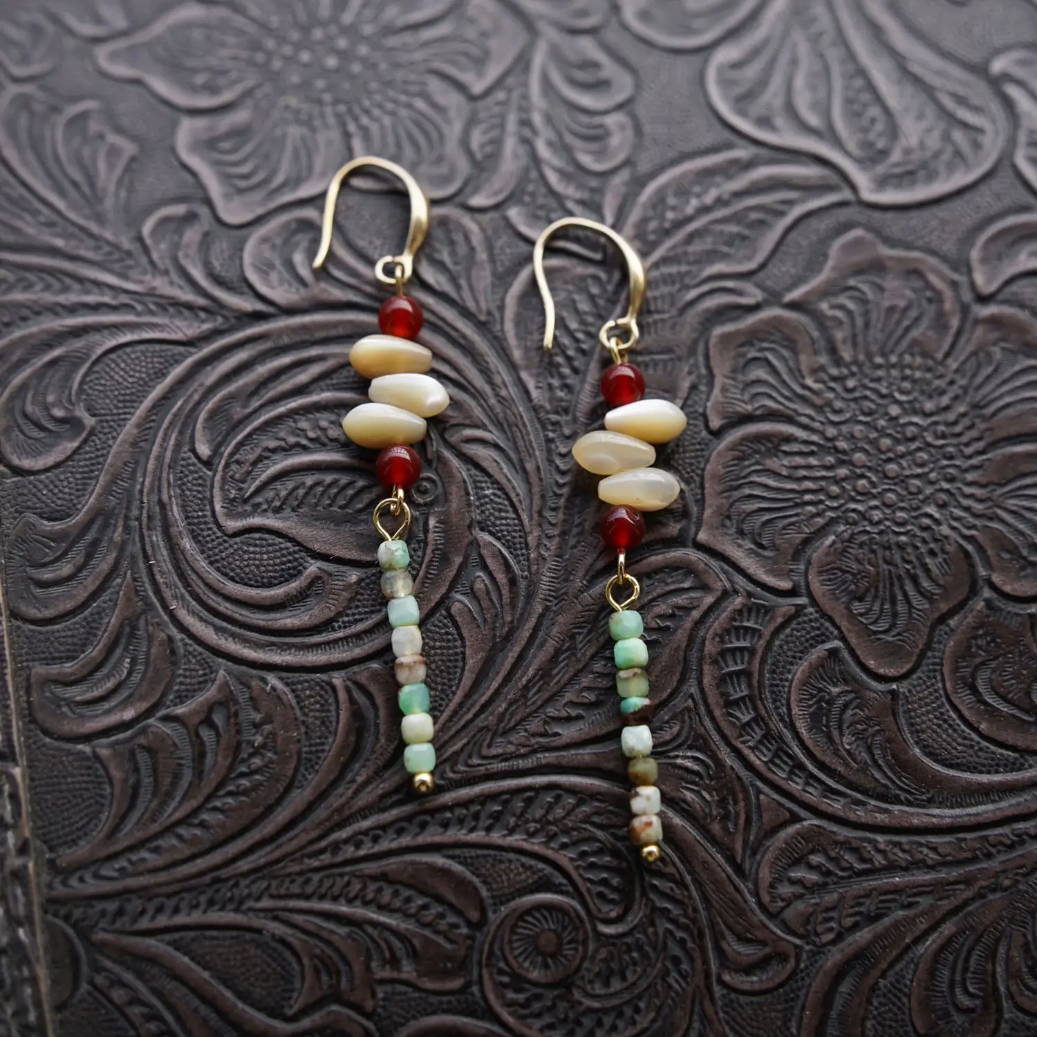 Special Note for Australian Jade, Shell, and Red Agate Dangle Earrings