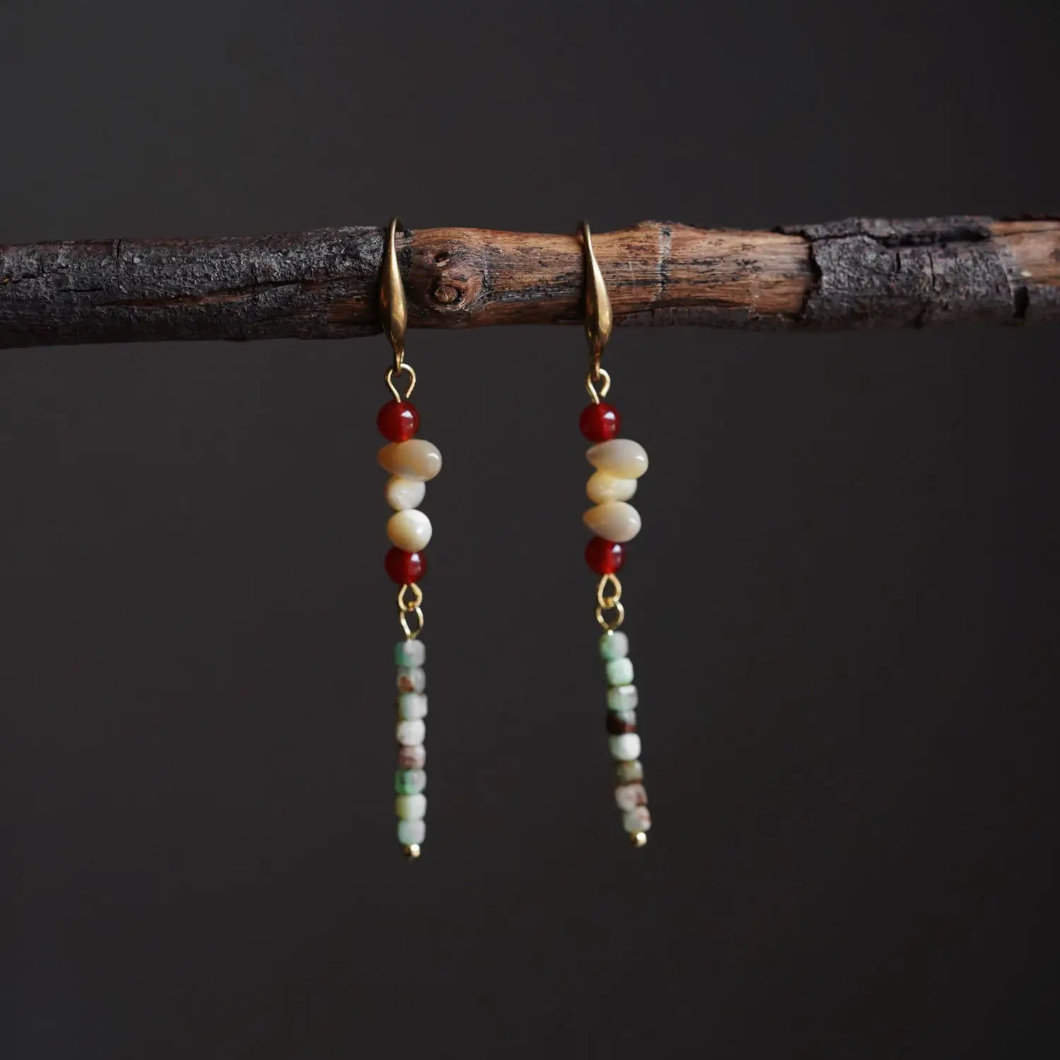 This long-dangle style features delicate natural materials, including Australian Jade, Natural Shell, and Red Agate, set on a 14K gold-plated brass hook. Due to the porous nature of the shell and stones, and the base material of the hook, this piece requires extra careful handling to maintain its shine and integrity.I. Daily Wear Cautions (Strict Removal Required)