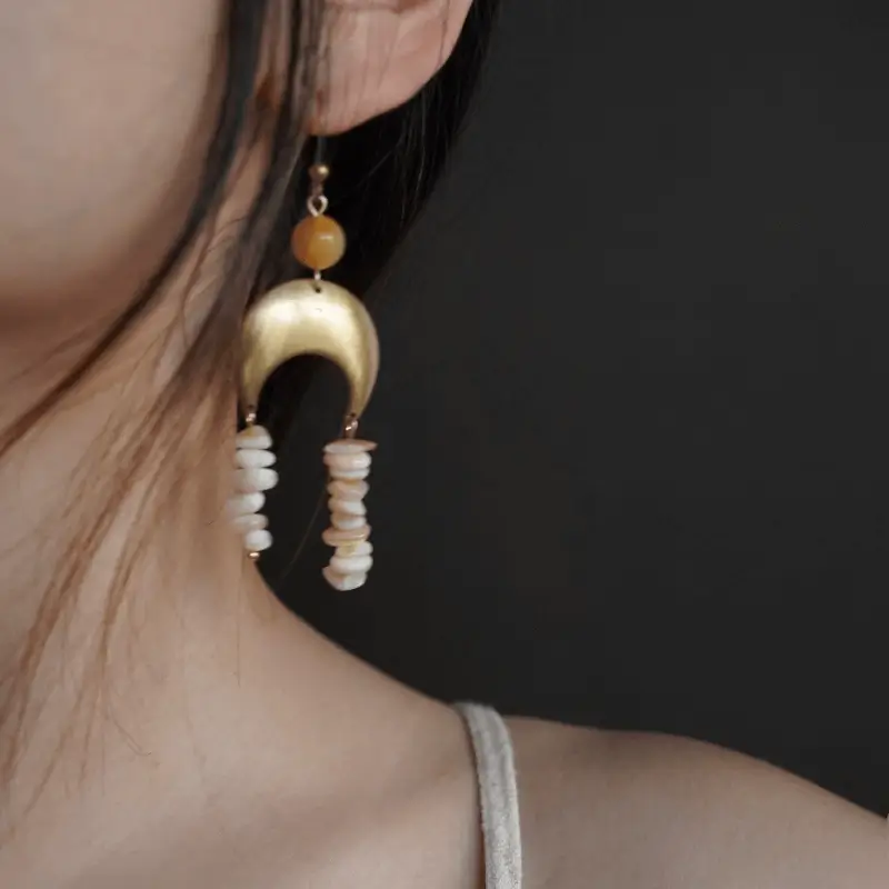 Inspired by the philosophy of Gong Chao Sheng (共潮生), these Handmade Organic Seashell Earrings capture the quiet dialogue between earth, water, and sky. Irregular shell fragments echo the raw poetry of the coastline, while the hand-formed brass crescent introduces a subtle lunar balance. Together with the yellow agate bead, they form wearable fragments of motion for those who find stillness in the rhythm of the sea.