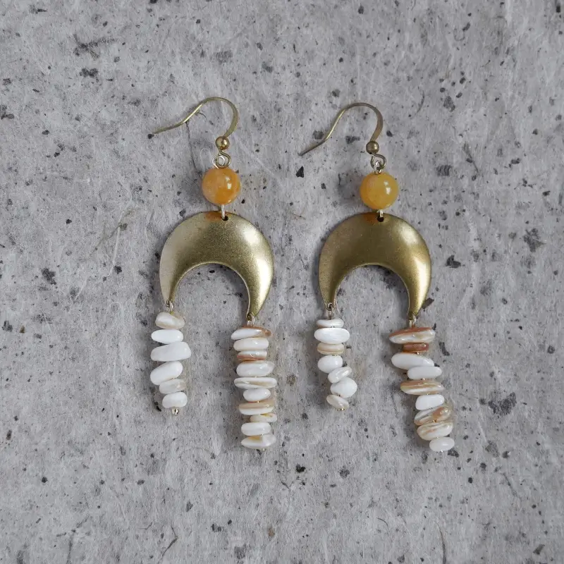 Inspired by the rhythmic poetry of sea and shore. These Handmade Organic Seashell Earrings capture the shared breath between ocean waves and sandy beaches. Irregular seashell fragments echo the wild beauty of the coastline, while a hand-formed brass crescent introduces a lunar balance. A warm yellow agate bead adds a subtle glow, creating a lightweight, organic silhouette perfect for free-spirited everyday elegance or refined vacation style.