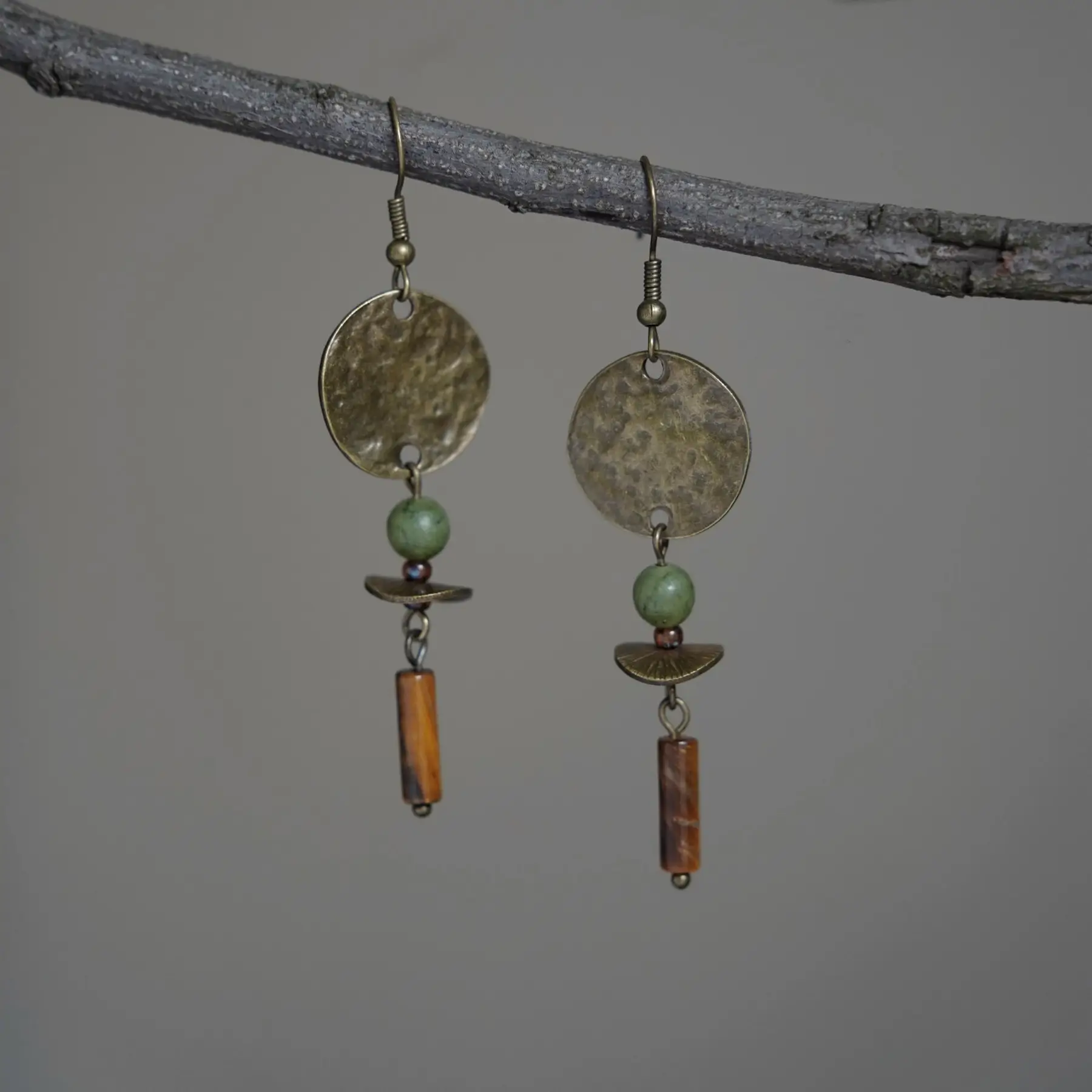 Wilderness Echo | Handmade Antique Brass Earrings with Tiger’s Eye & Jade