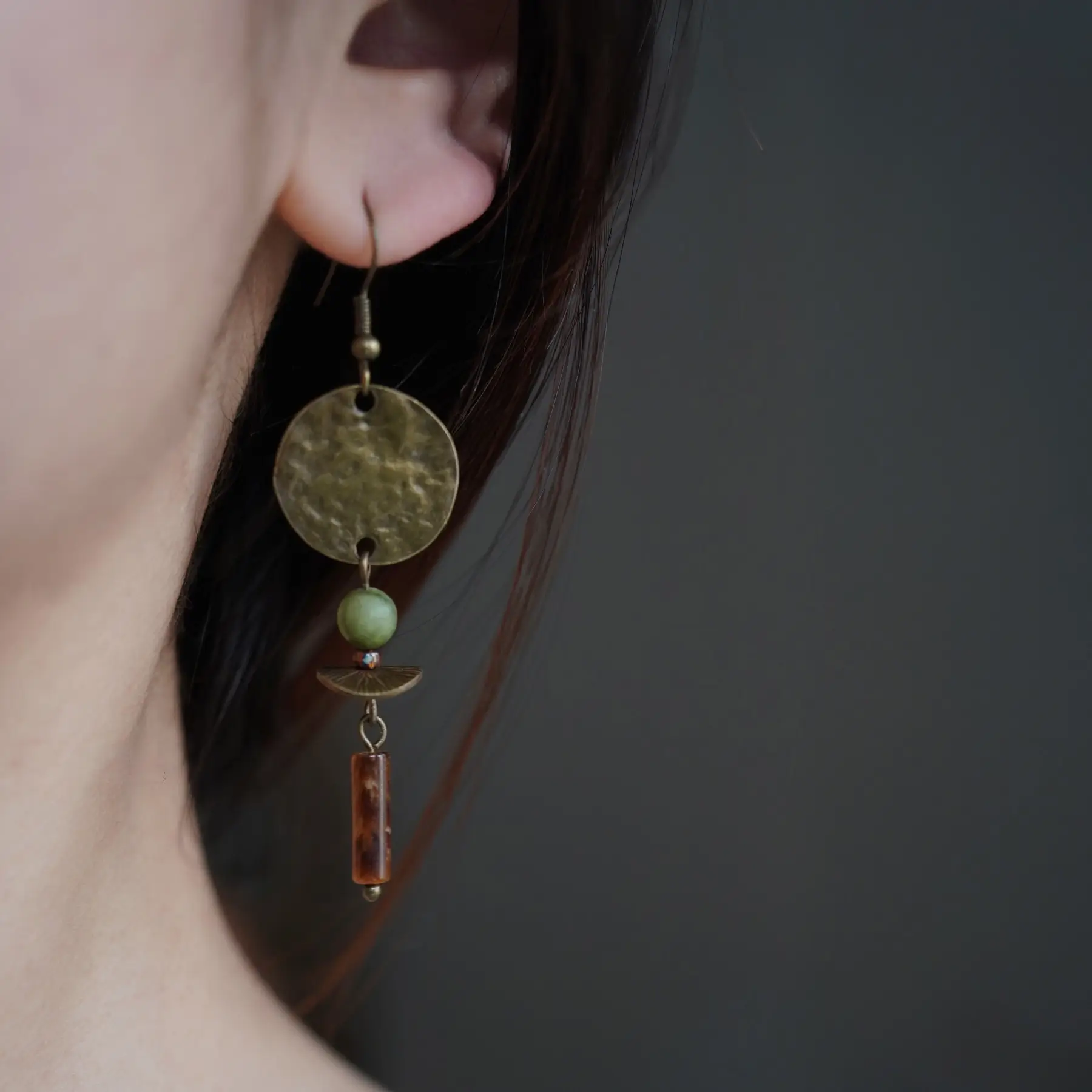 The earrings combine aged brass with warm tiger’s eye and smooth southern jade, reflecting a grounded, earthy elegance. They pair beautifully with linen shirts, relaxed blouses, or flowing earth-toned dresses. Their gentle movement adds a subtle statement—perfect for travel, gatherings, or quiet everyday moments.