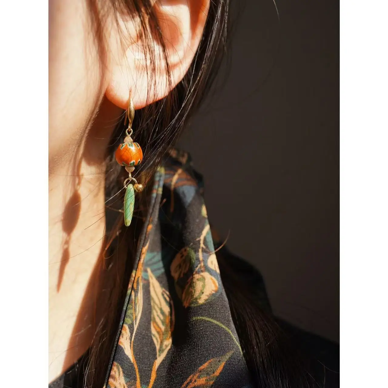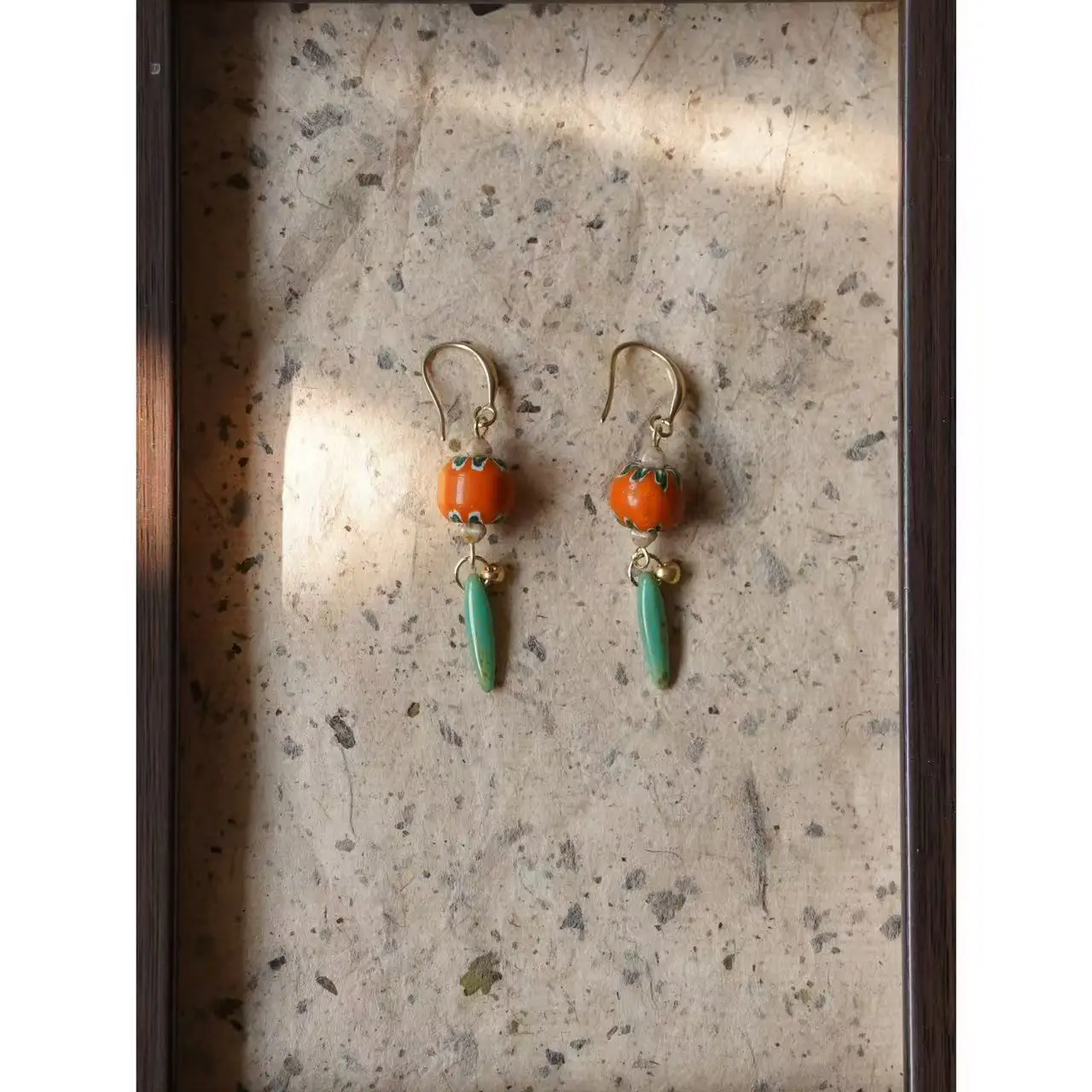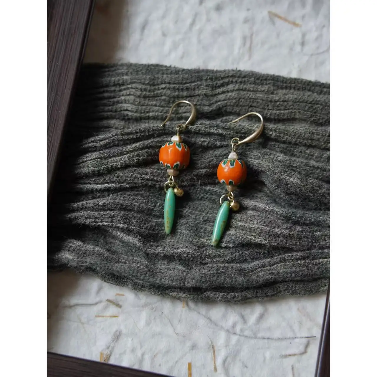 Inspired by the ancient murals of Dunhuang, these Handmade Vintage Glass Bead Earrings capture the meeting of warm desert dunes and a flowing azure river. The glowing orange bead reflects sunlit sand, while the distressed green glass drop evokes an oasis cutting through the vast landscape.