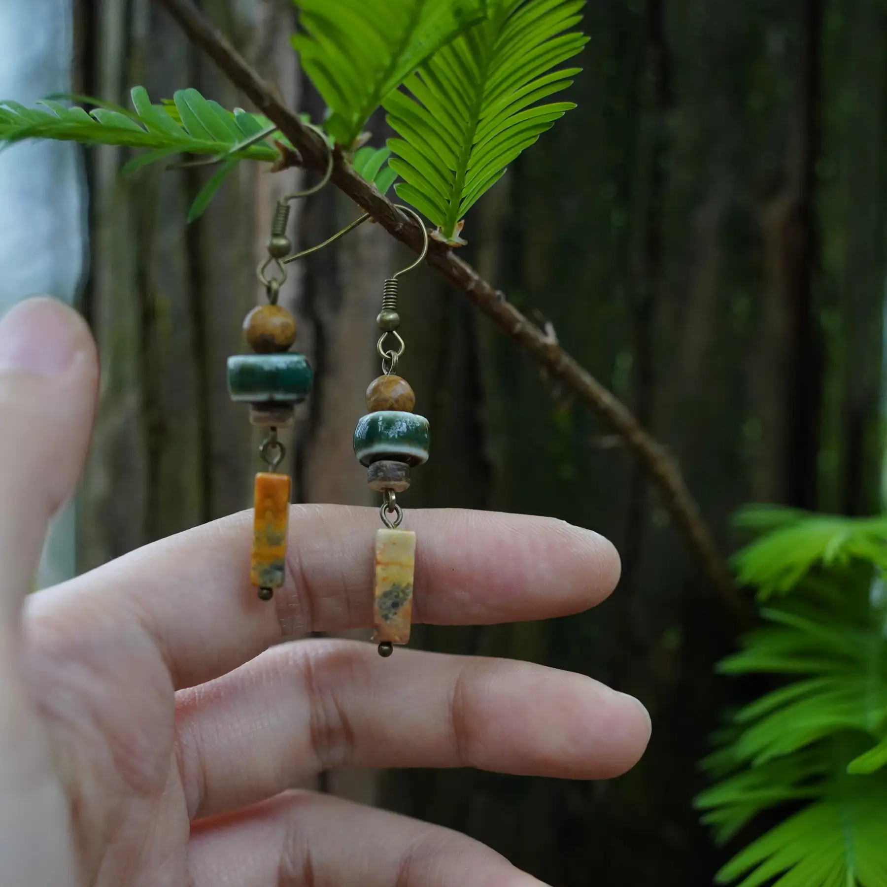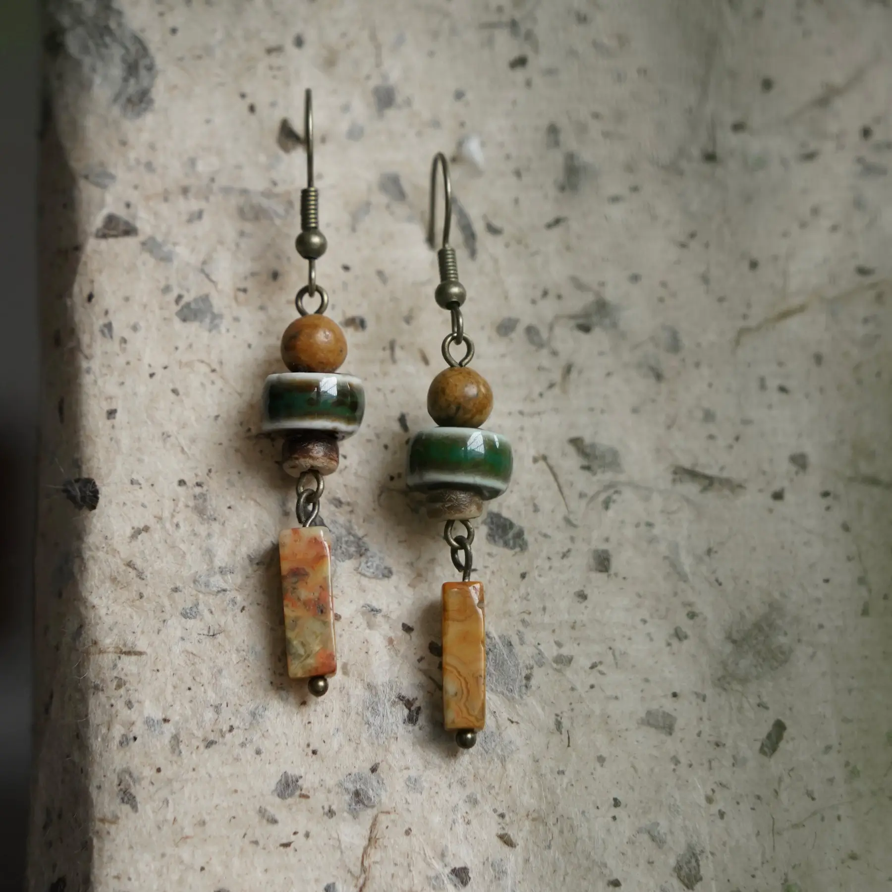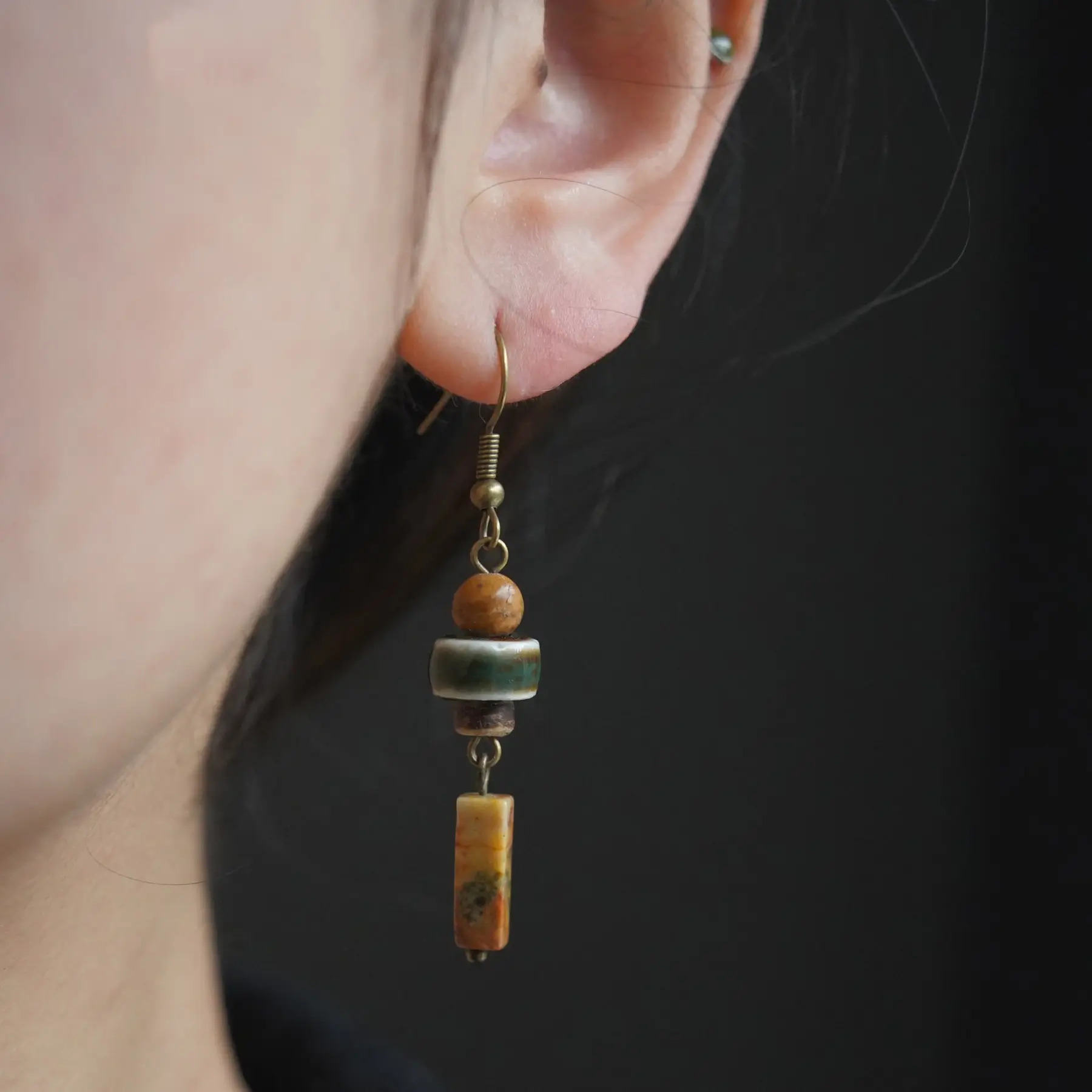 We use genuine natural stone beads paired with handcrafted ceramic elements. You may choose 925 sterling silver hooks or a comfortable clip-on option for non-pierced ears.