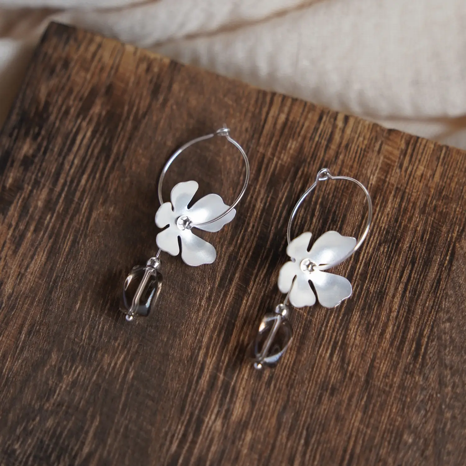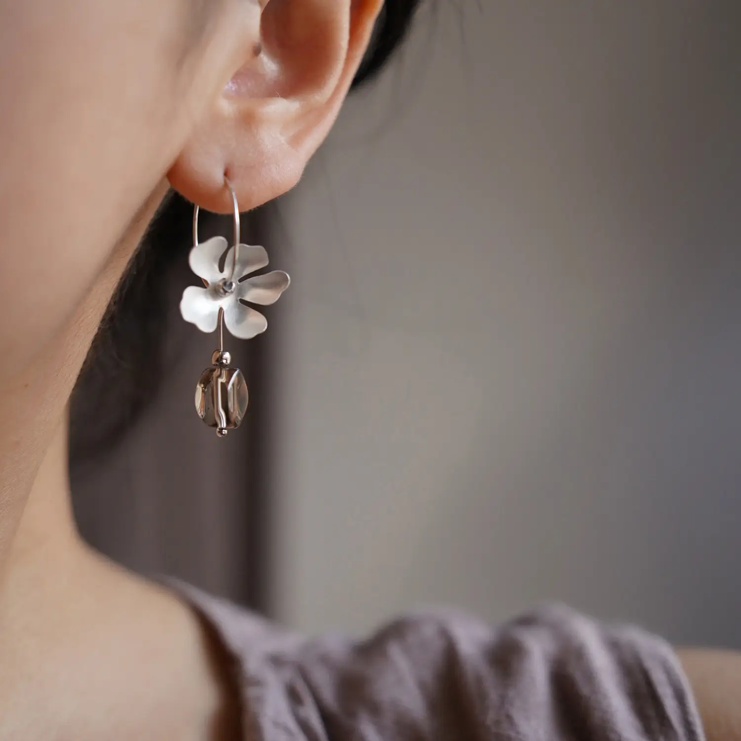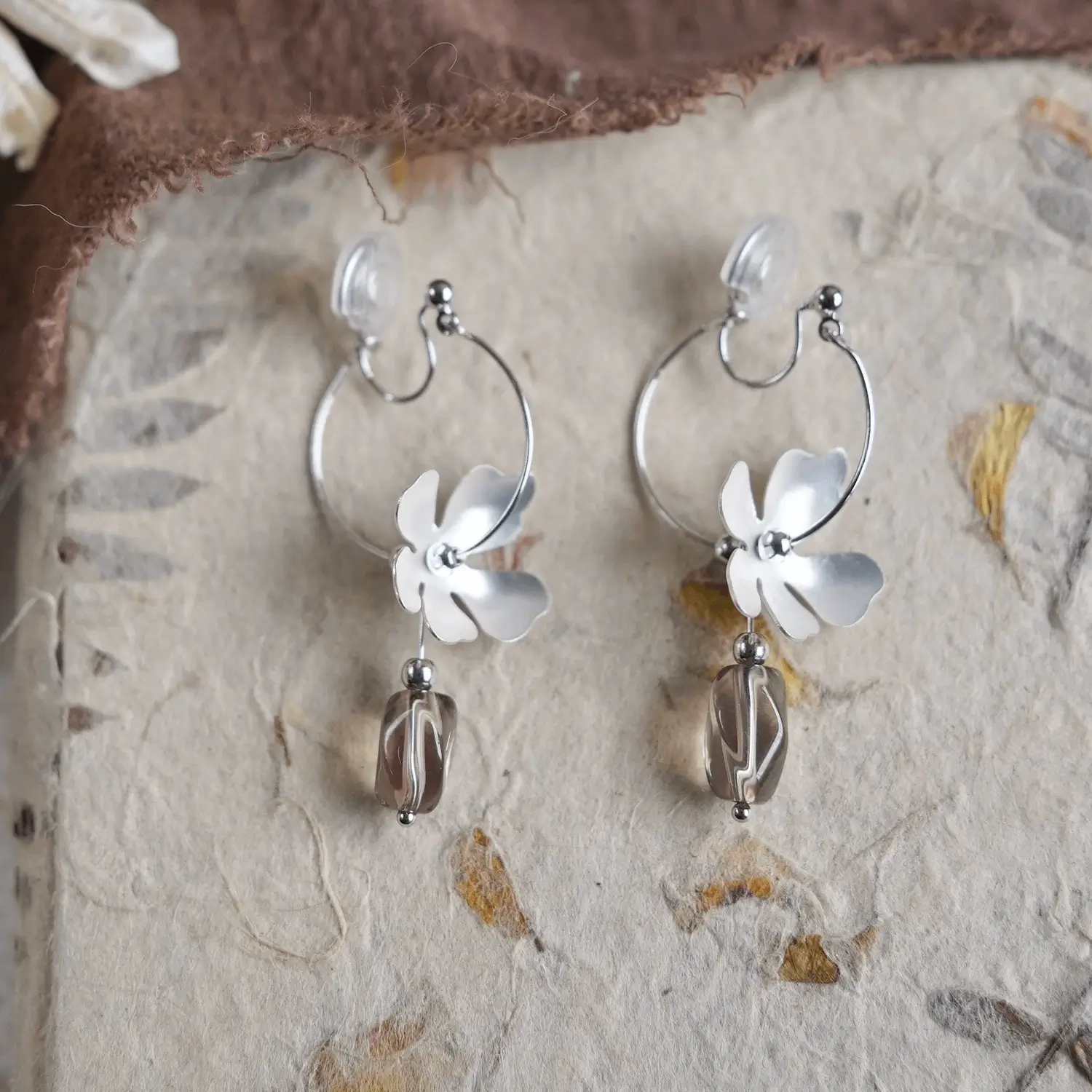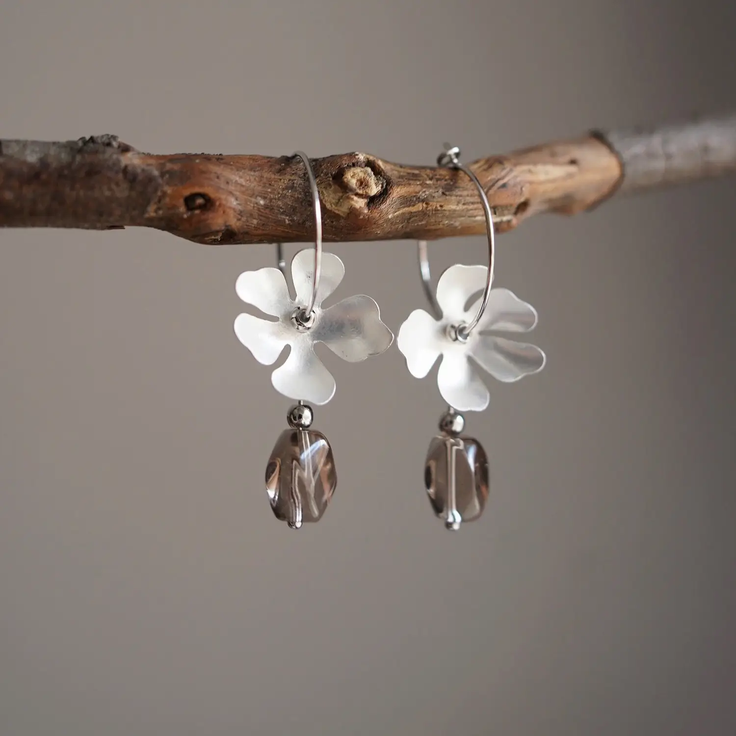 Small-batch handmade craftsmanship, organic botanical details, and grounding smoky quartz make it a quiet, unique statement compared to mass-produced silver hoops.