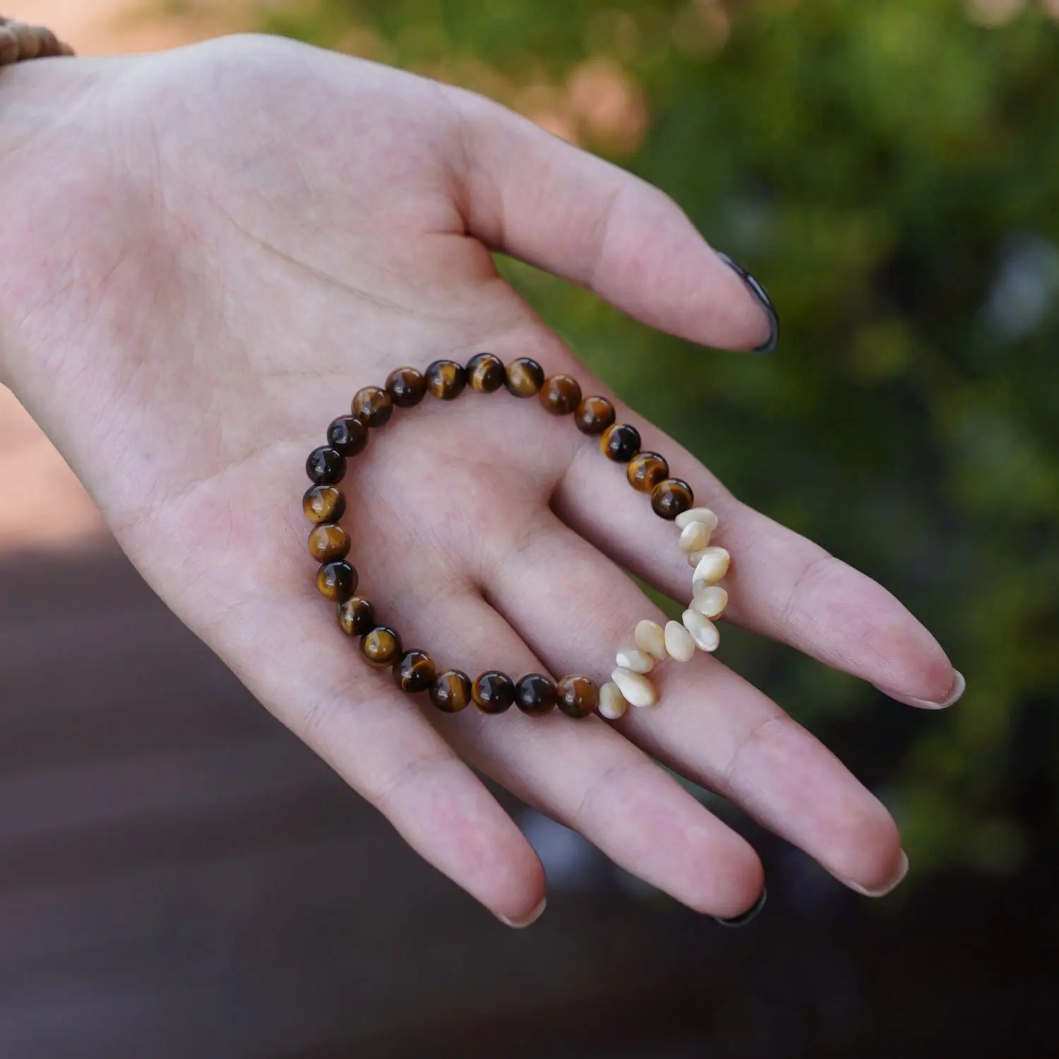 To make this bracelet truly special, we’ve paired smooth Tiger’s Eye beads with natural seashell beads accents. This thoughtful combination blends natural textures with modern craftsmanship, creating a piece that feels both grounded and sophisticated.