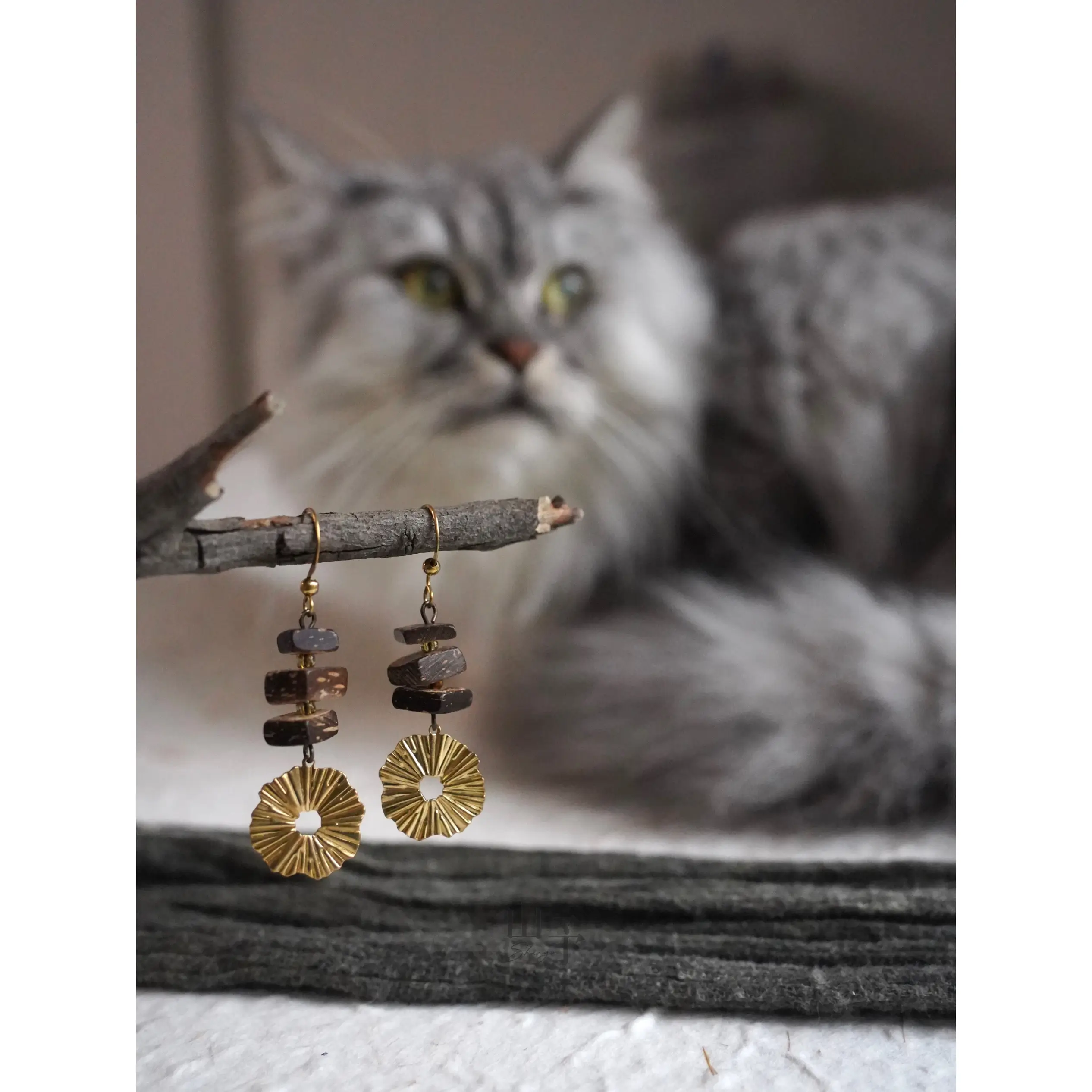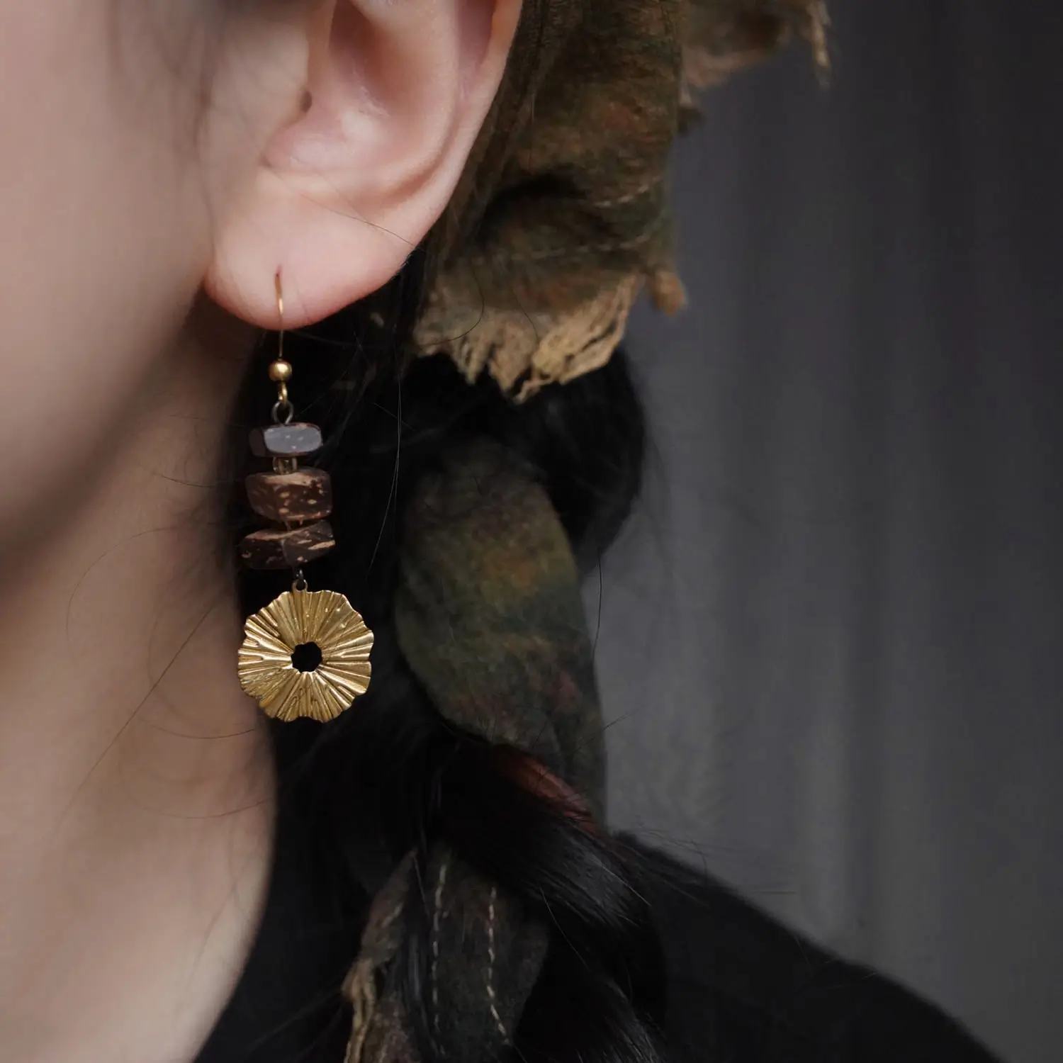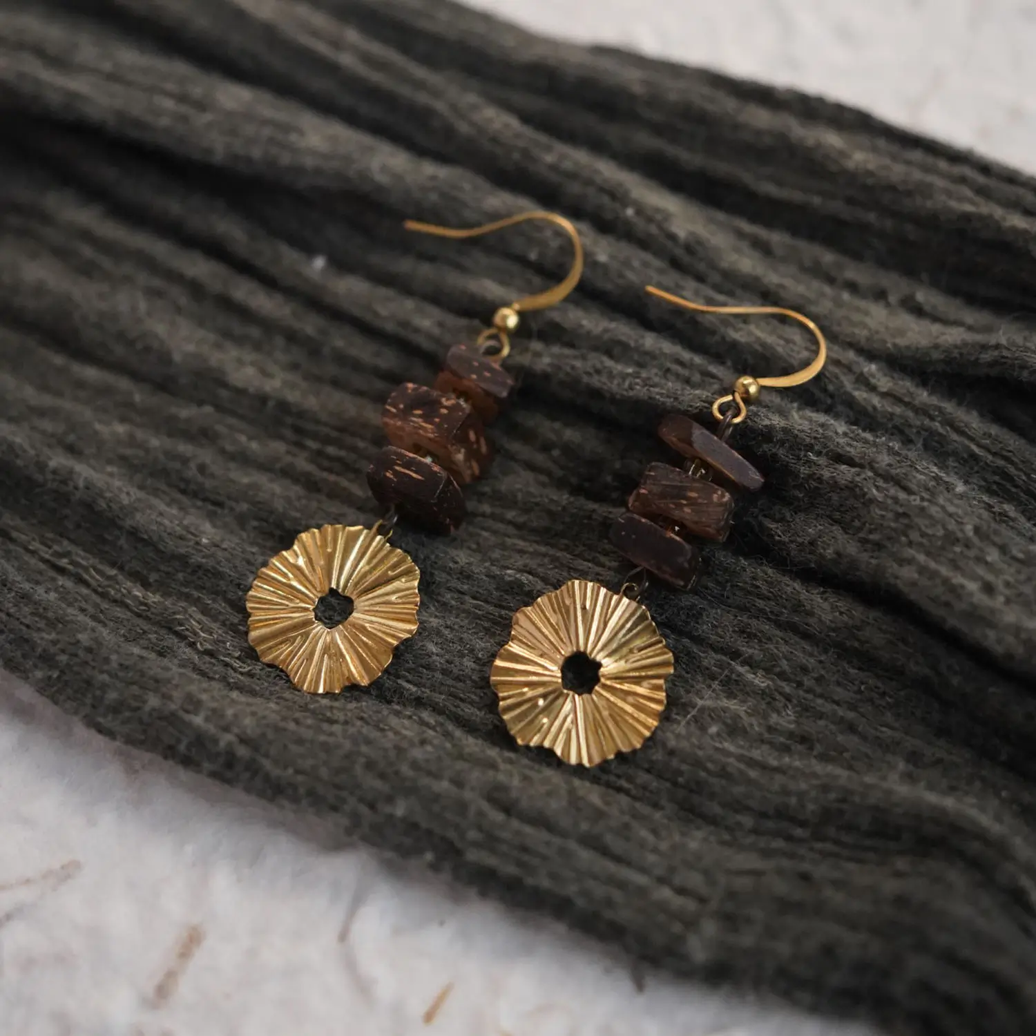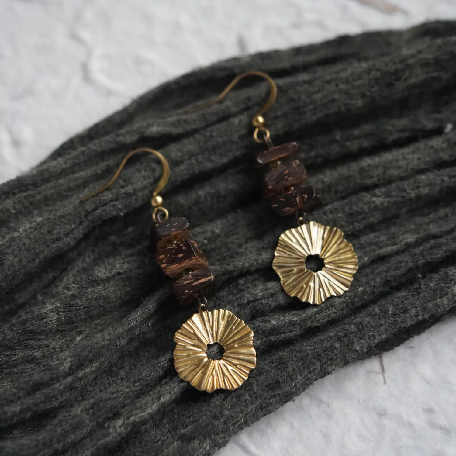 Handmade vintage earrings with brass and coconut wood details. Featuring a Zen-inspired design and gold-plated finish, perfect for calm everyday style.