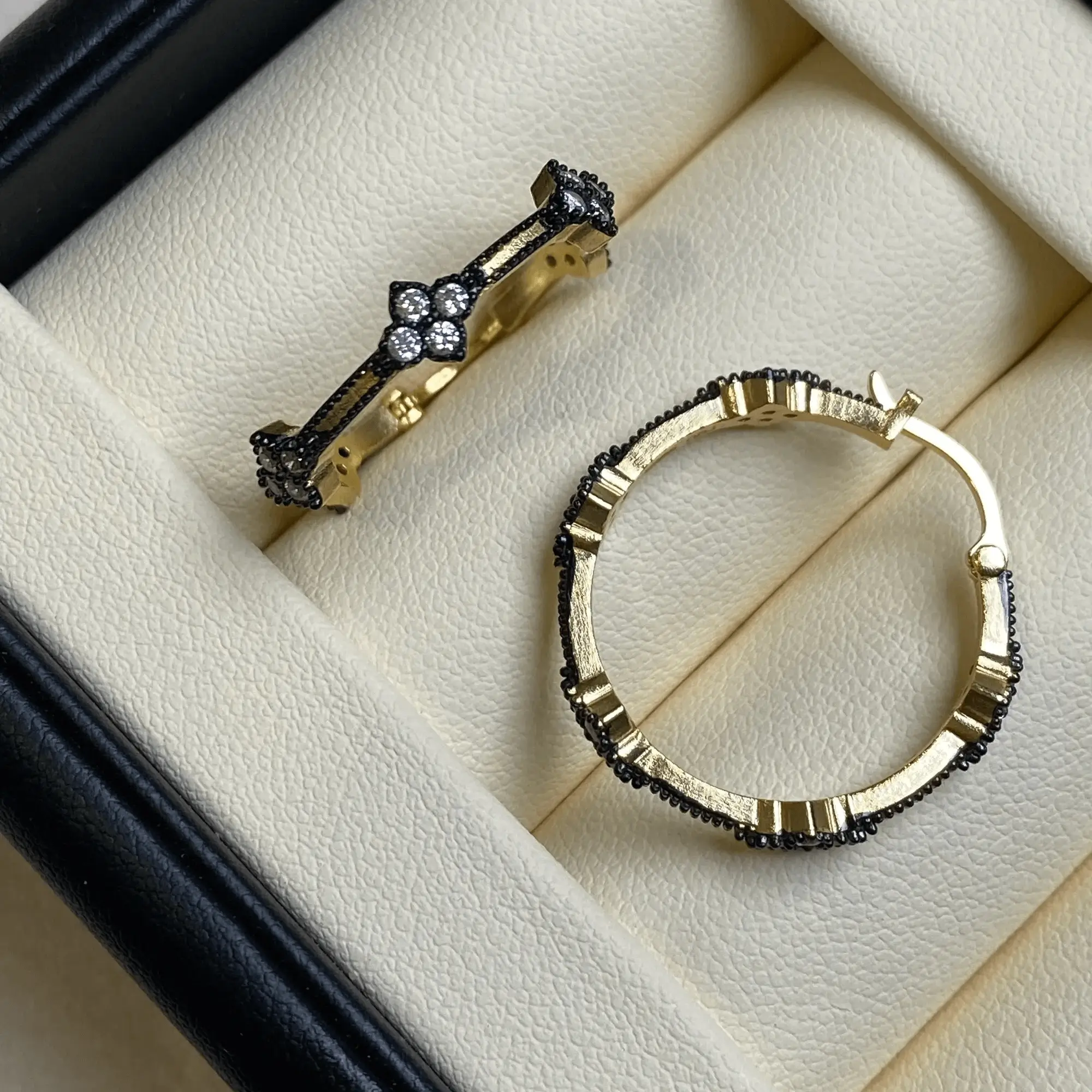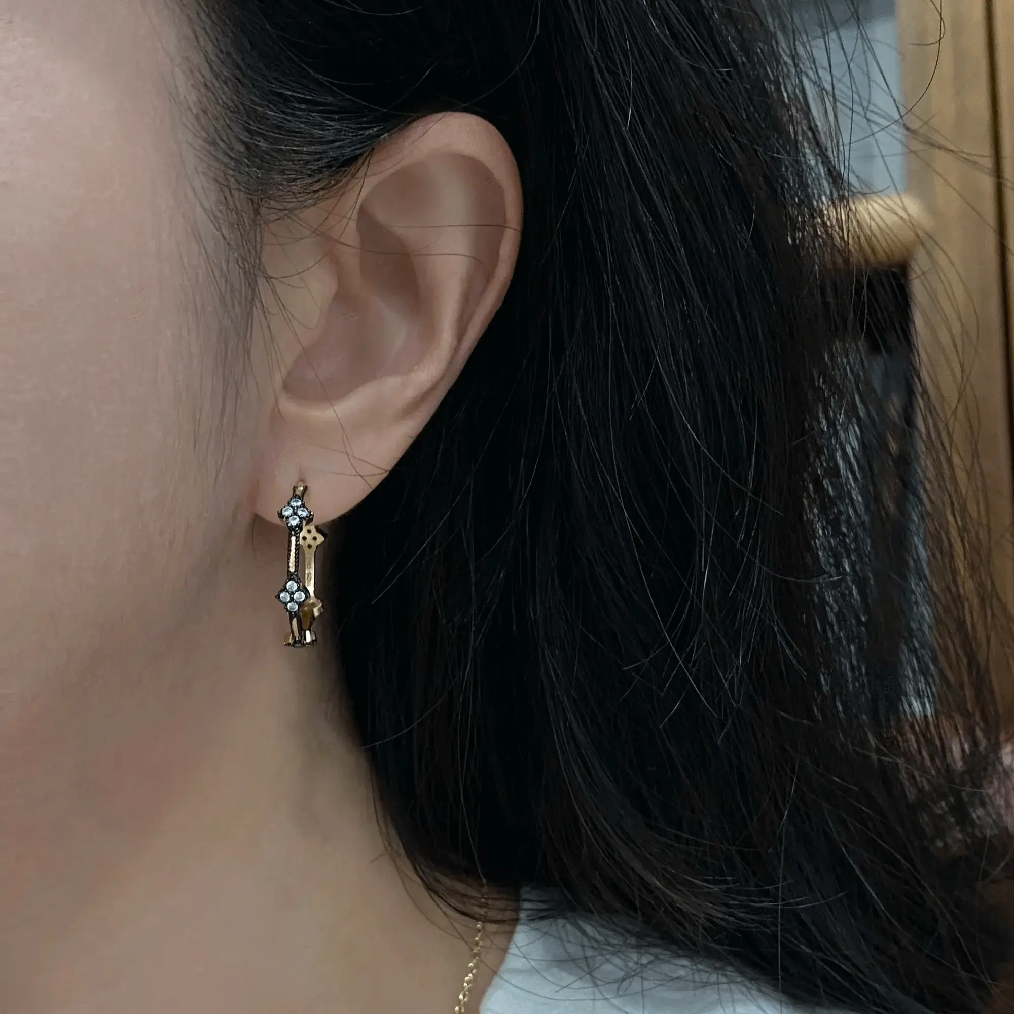 These vintage silver hoop earrings blend timeless elegance with a touch of symbolism. Inspired by the four-leaf clover, each leaf represents honor, wealth, love, and health. The tubular structure and smooth curves give the hoops a powerful, textured presence. Accented with shimmering zircons that illuminate the gold and black finishes, they transition effortlessly between minimalist and statement looks.